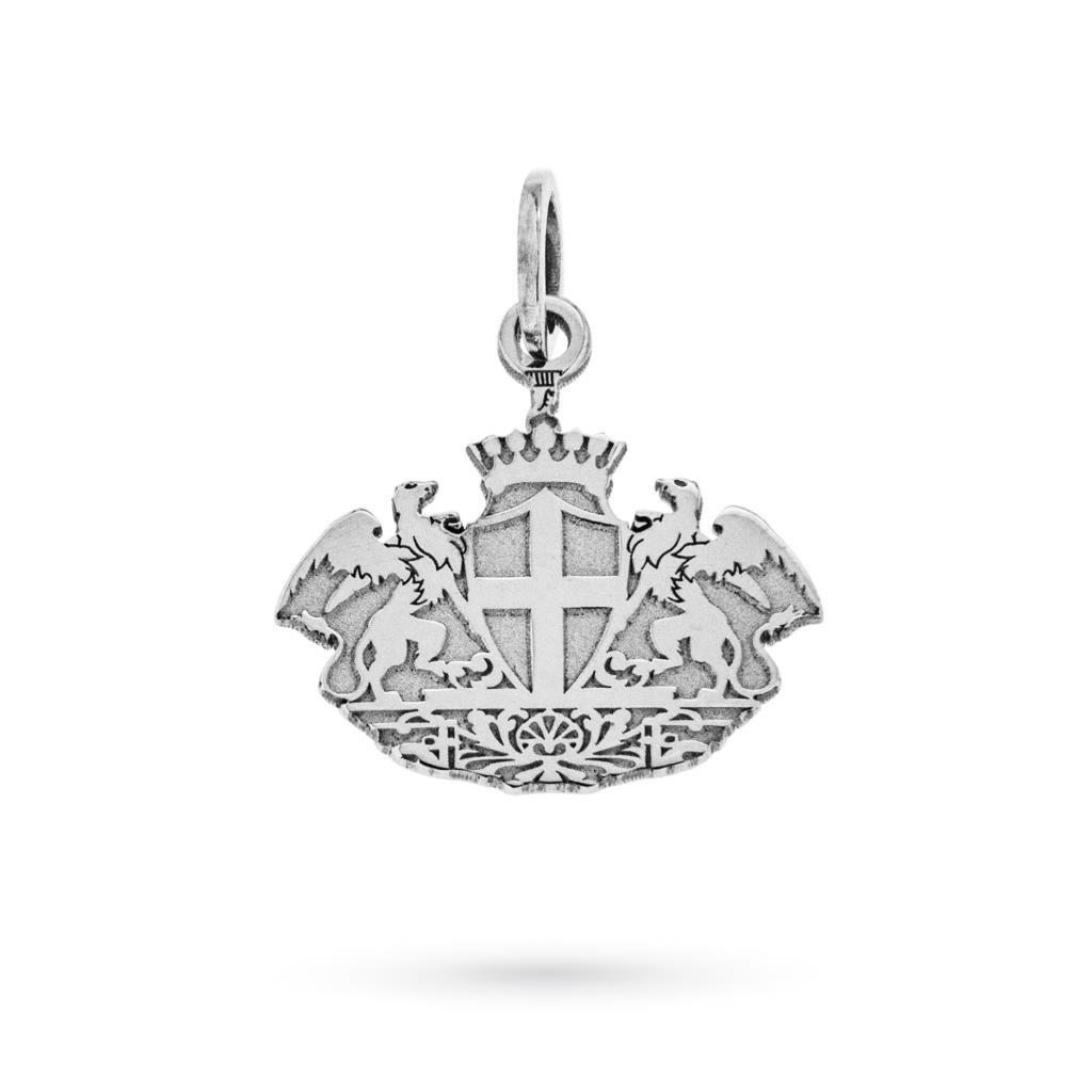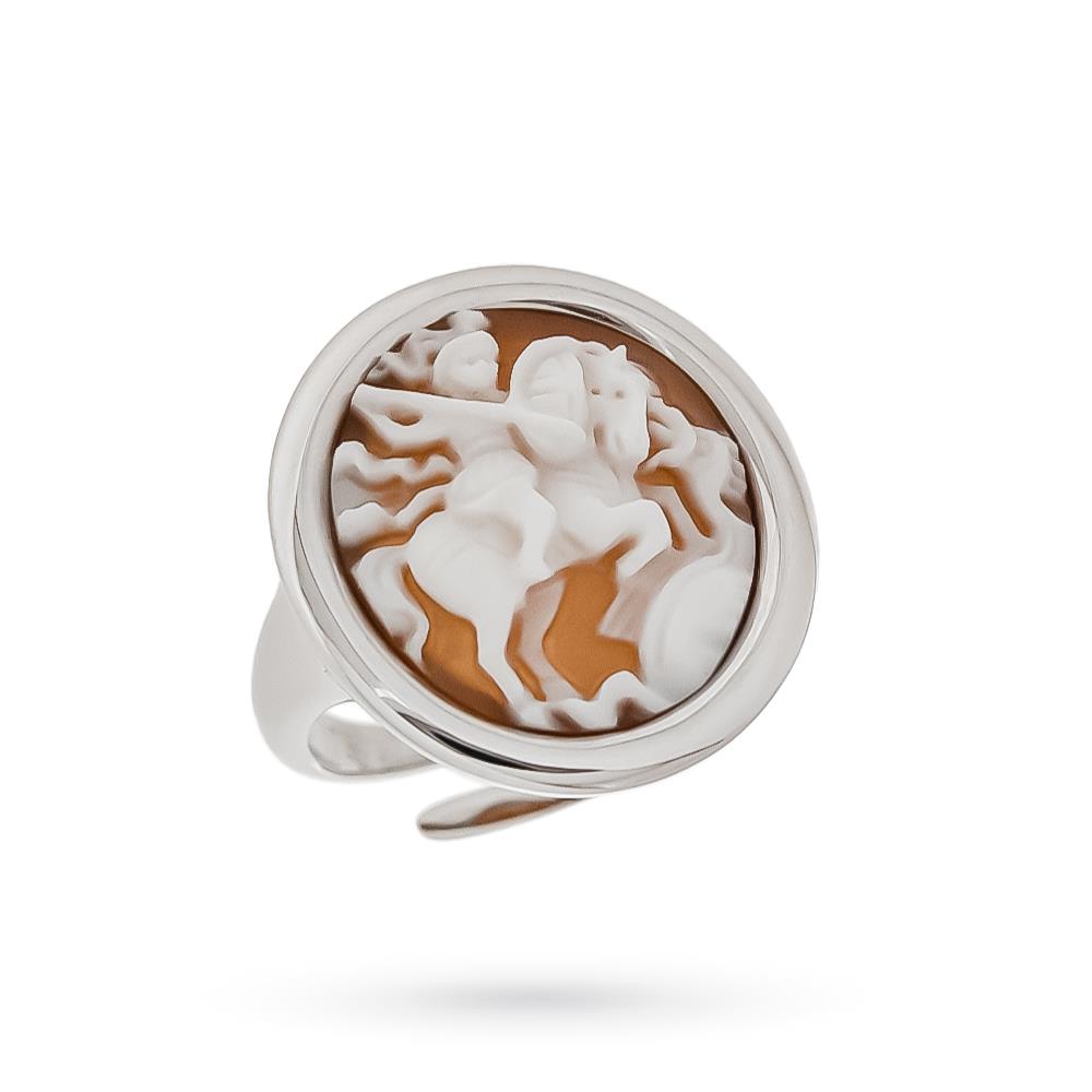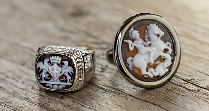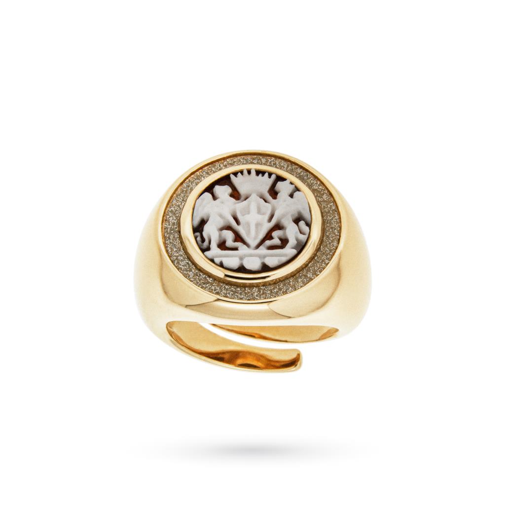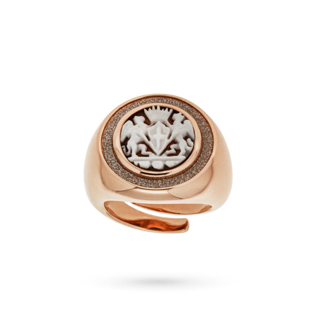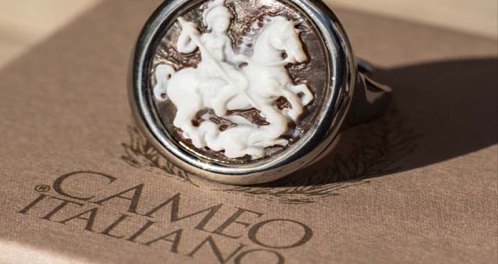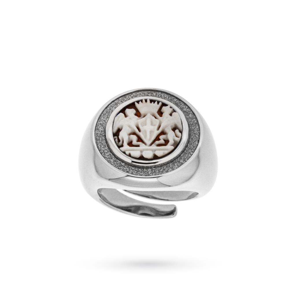 l cammeo, in conchiglia naturale, è sempre inciso a mano a Torre del Greco a Napoli: ogni anello è perciò una creazione unica diversa da tutte le altre. Non esisteranno mai due anelli uguali. Le due versioni, in argento e argento brunito, riportano al loro apice lo stemma di Genova e l'icona di San Giorgio e il Drago.