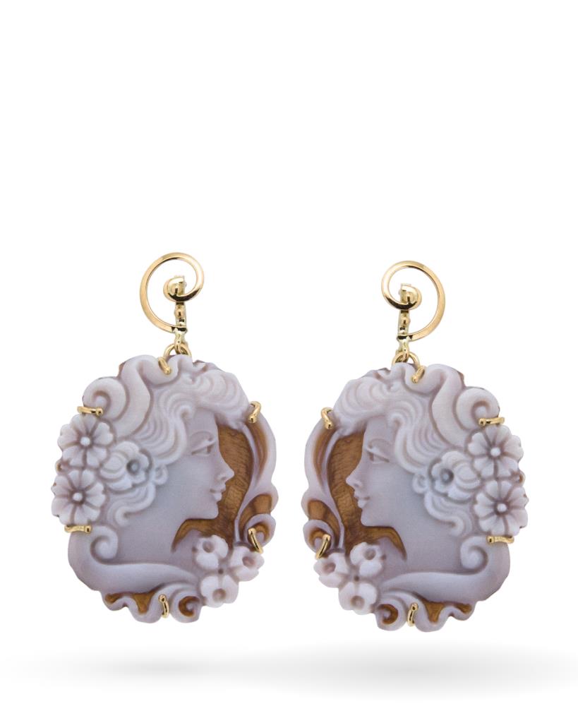 The pendant of each earring is an elegant hand-engraved cameo depicting a female body with a floral frame.