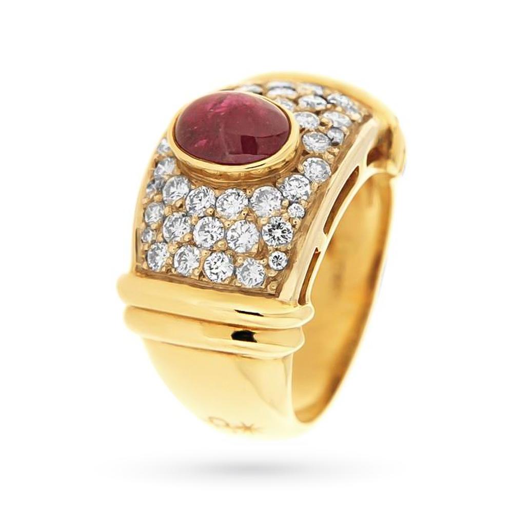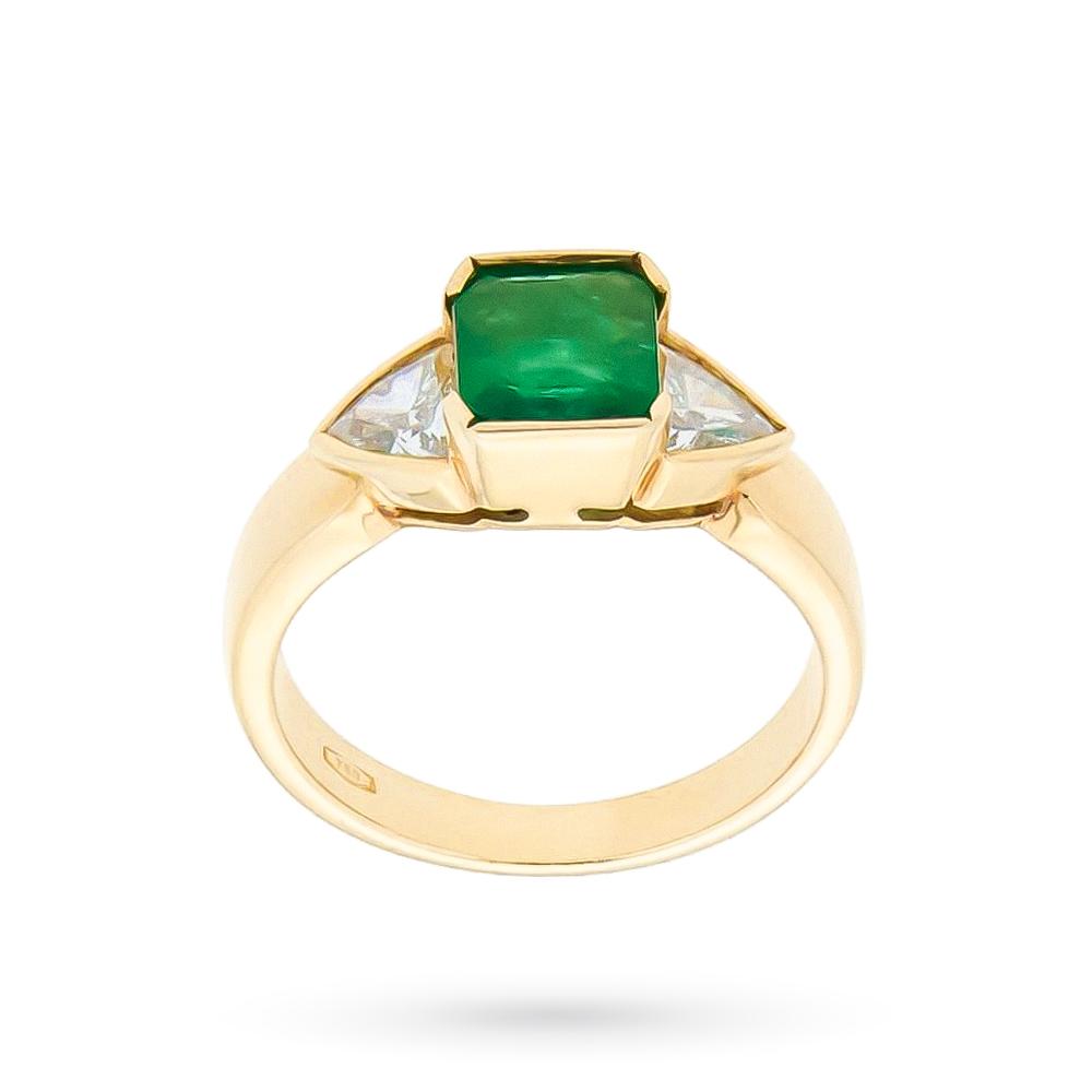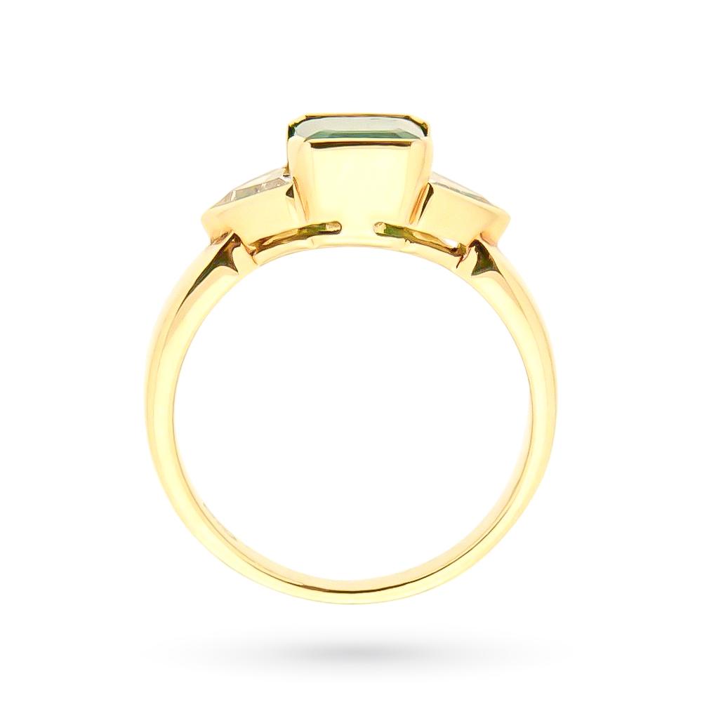 A magnificent ring made of 18kt yellow gold and characterized by an exceptional step-cut emerald and two splendid triangle-cut diamonds placed on the respective sides of the jewel. A real work of art of Made in Italy jewelry that gives unparalleled refinement and elegance. It comes with box and guarantee signed Cicala.