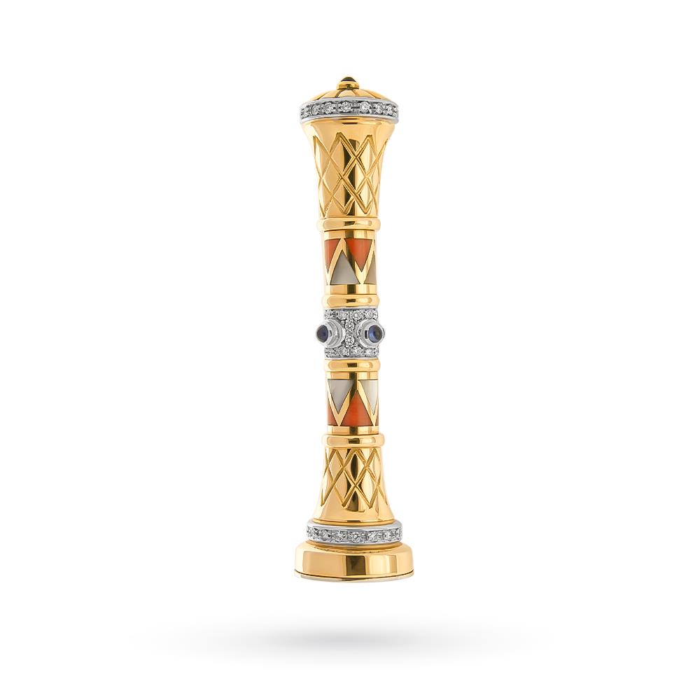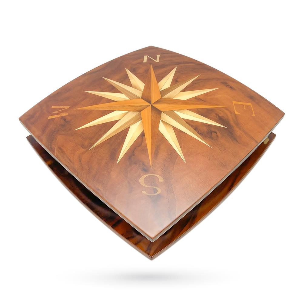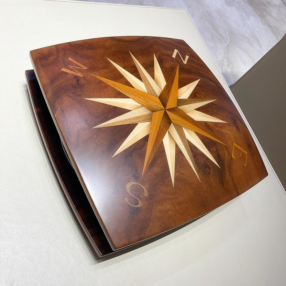 It is entirely created in walnut wood with inlays.