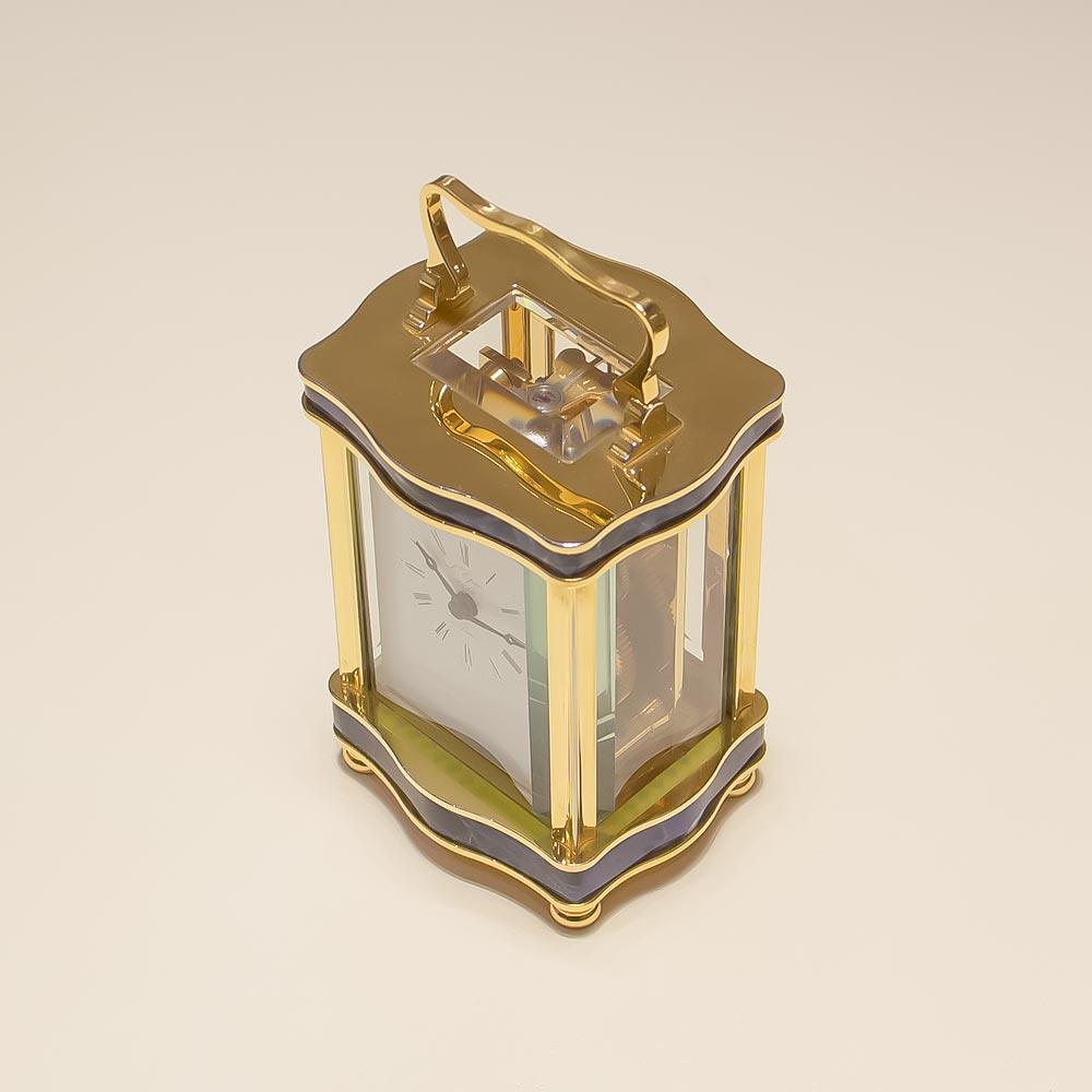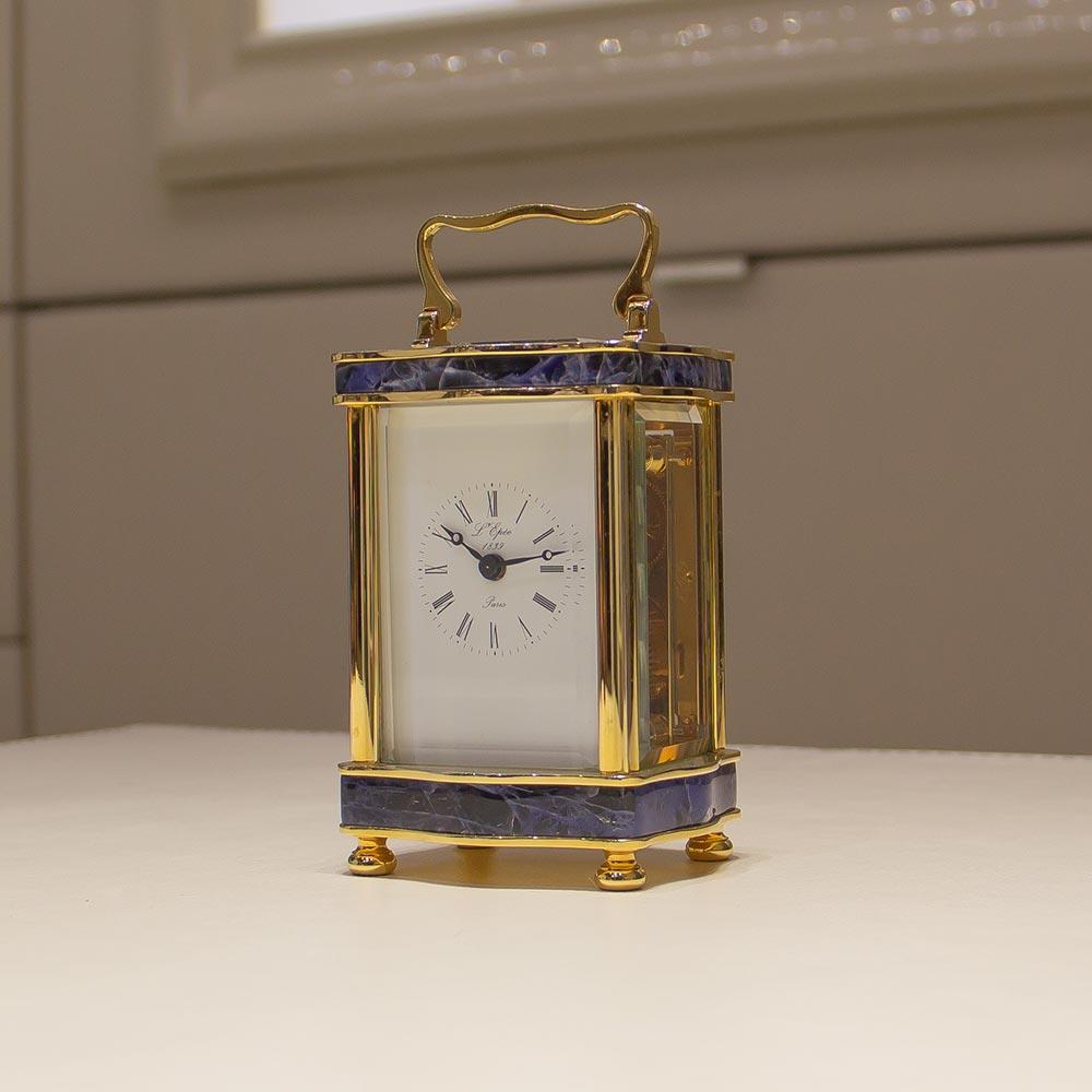 L'Epee Doucine Miniature clock in sodalite brass. L'Epee Doucine Miniature clock in gilded brass with sodalite enamel. A true masterpiece that absolutely represents the best watch manufacturing art. This wonderful L'Epee officier table clock is made of plated brass with surface gold plating. The dial is white with black Roman numerals, easy to read. Equipped with a manual winding mechanical movement with an 8-day power reserve and various functions that embellish the mechanics itself. Model: L'Epee Doucine Miniature - Dimensions: 6 x 5 x 11 cm.