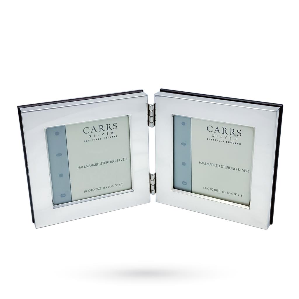 The photo you are looking at shows a nice double frame in 925 silver for two photographs of 8x8cm size; the edge is shiny and smooth and measures 1.5cm. The external measure in maximum extension is 20 x 10cm. Wooden back. Made by the silversmiths of the Carr's England firm, the object is distinguished by the typical English silverware symbols.