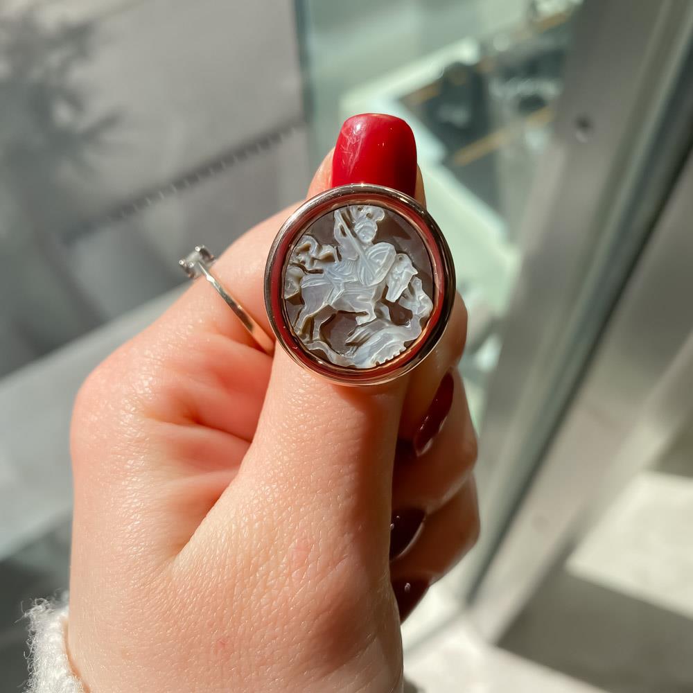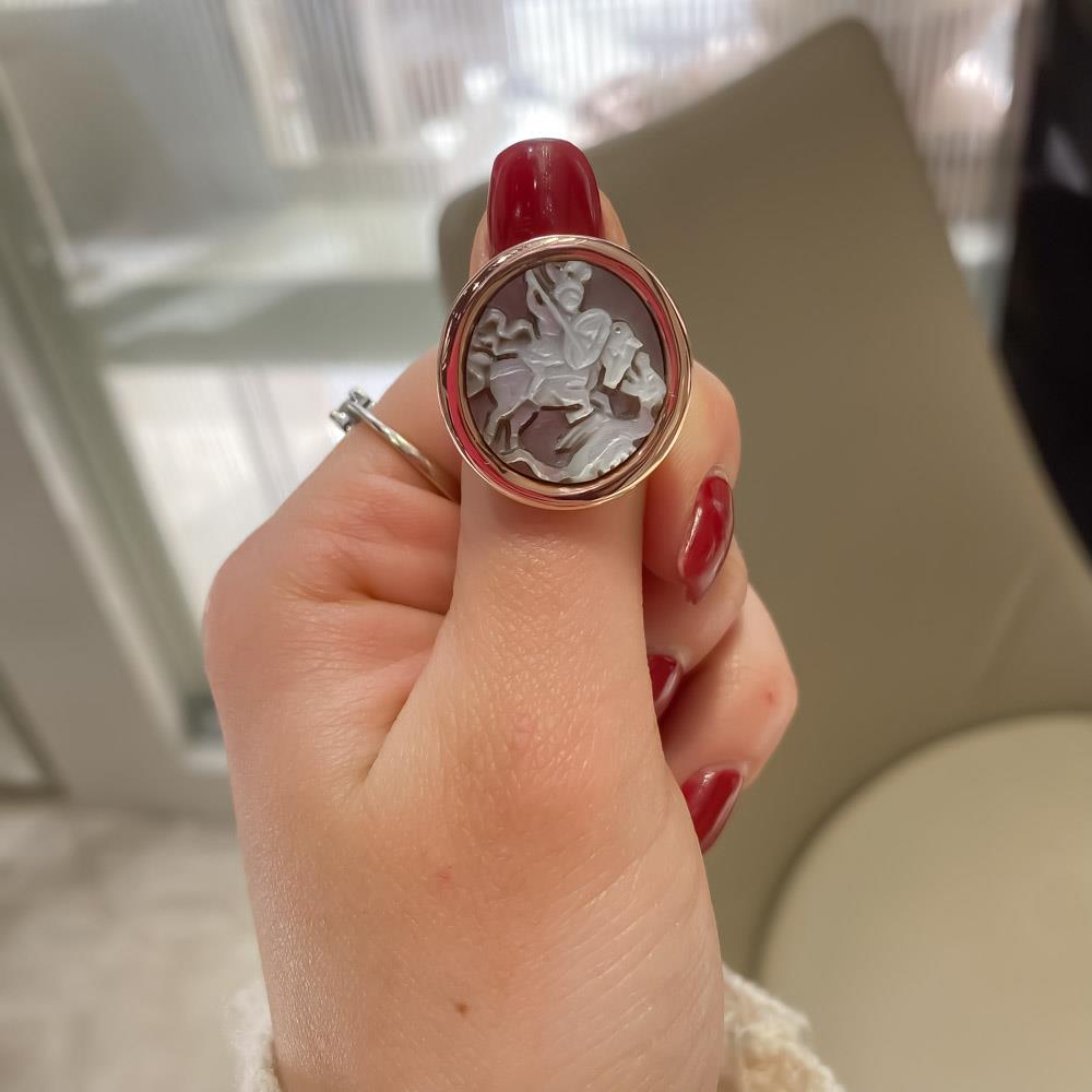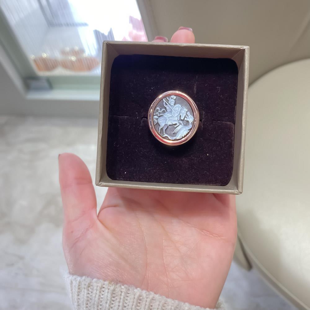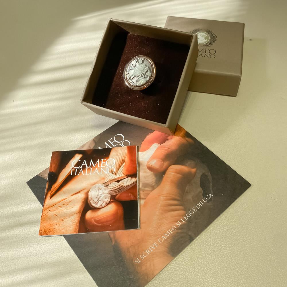 The Genova ring is made with an elegant nickel-free hypoallergenic rose gold plated 925 silver setting with a shiny surface. At the apex of the jewel there is a very special natural shell cameo handcrafted by master engravers in Torre del Greco, Italy, representing the Coat of Arms of San Giorgio. The stem is open and independently adjustable according to the finger on which you want to wear it. The peculiarity of this cameo is the figure created in Mother of Pearl. The cameo has a diameter measurement of 12 mm.