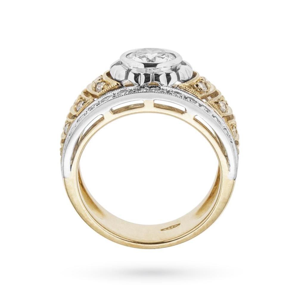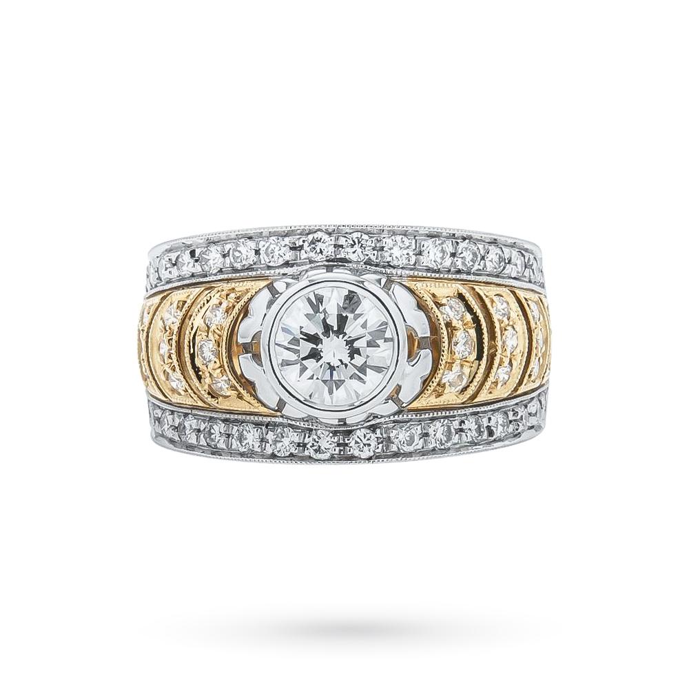 Solitaire diamond gold band ring 0.80ct with diamonds 0.81ct. This splendid handcrafted ring is made of 18kt yellow and white gold. Its peculiarity is the presence, on the upper part, of a large diamond that stands out among the dense pavè of brilliant-cut diamonds. The filigree workmanship of the gold also creates breathtaking sparkles.