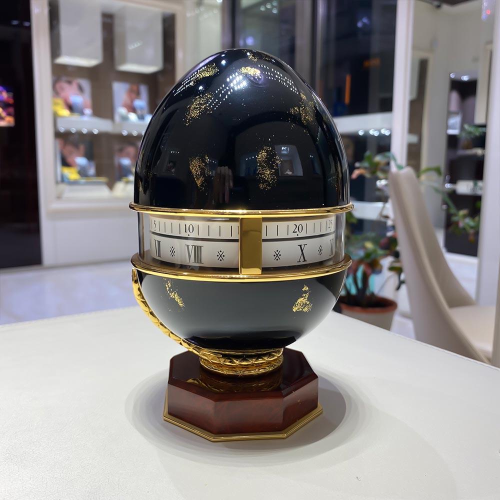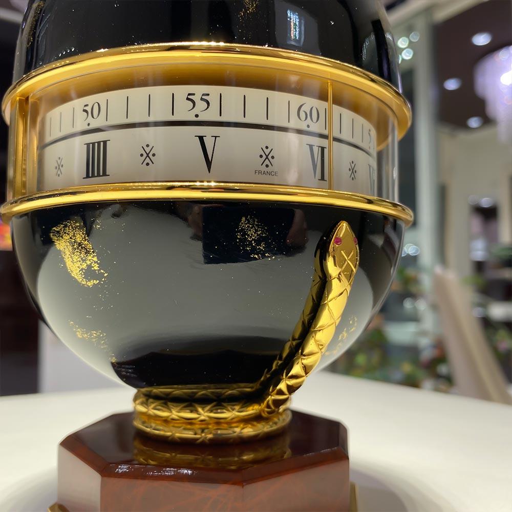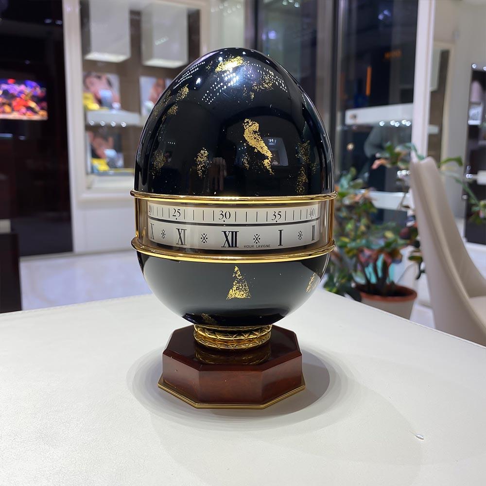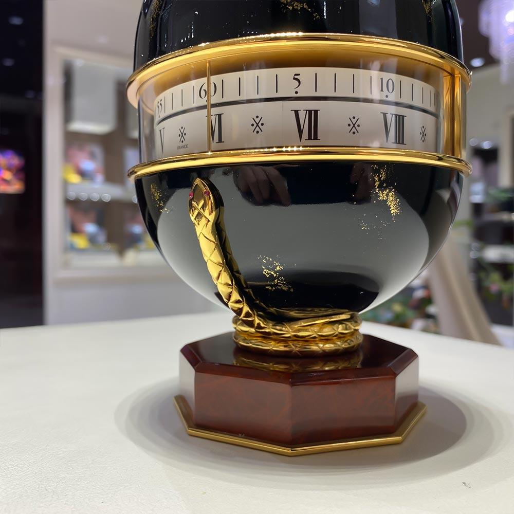 Hour clock Lavigne black egg golden snake. Hour Lavigne egg-shaped clock is a handcrafted art object. This prestigious table clock has the shape of a black lacquered egg. The dark surface is embellished with golden parts. The time is indicated by the head of the snake.