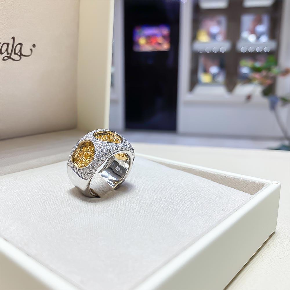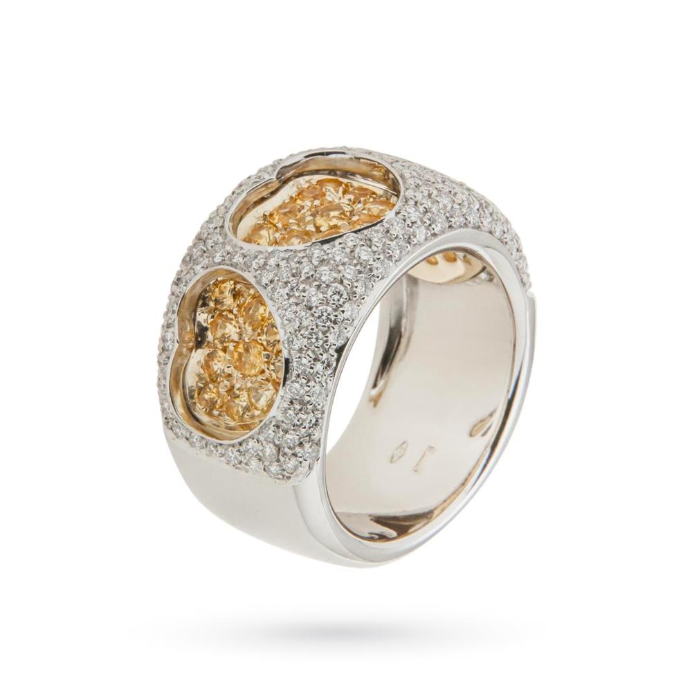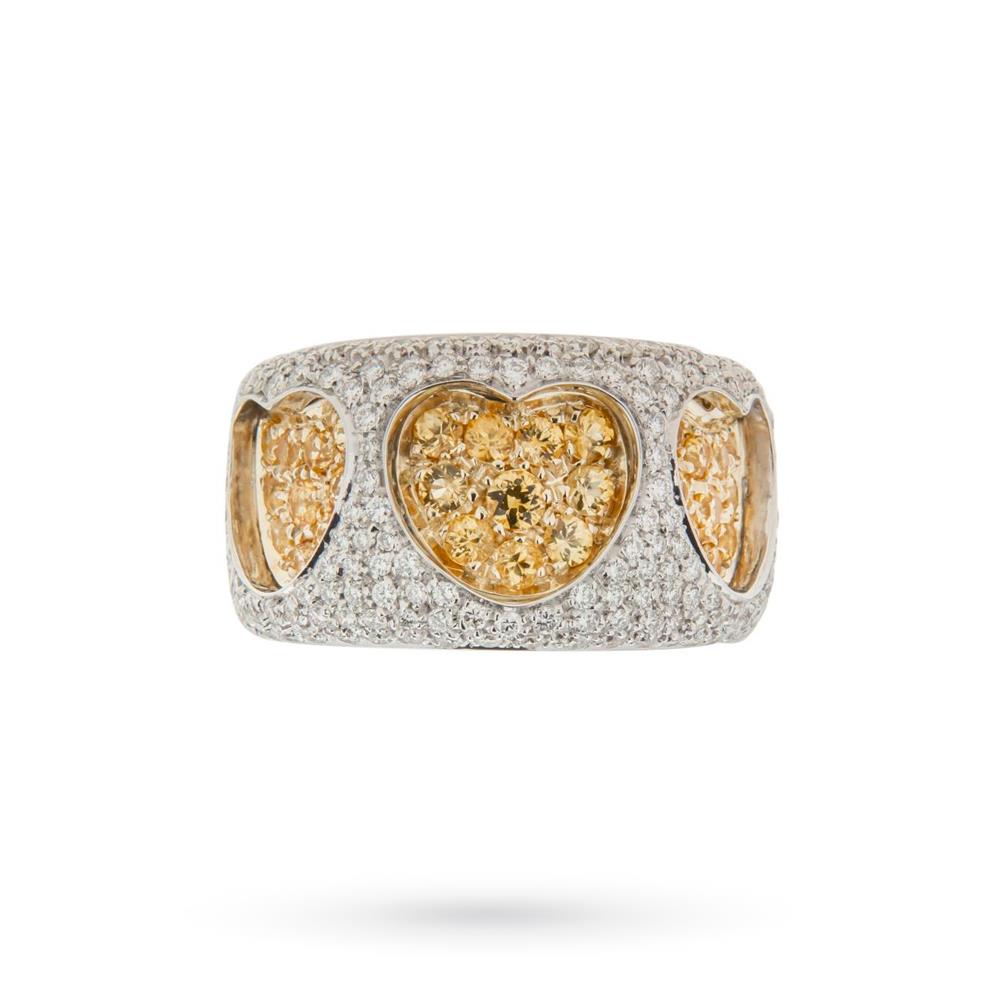 This ring by Giorgio Visconti is made of 18kt white gold. Its peculiarity is the presence, on the upper part, of 3 romantic hearts composed of yellow sapphires, which stand out in the middle of the dense layer of brilliant-cut diamonds. The carats are respectively 0.94 ct of diamonds and 1.35 ct of yellow sapphires. The total weight of the ring is 16.7g, reflecting its size and solidity.