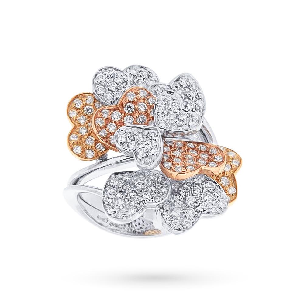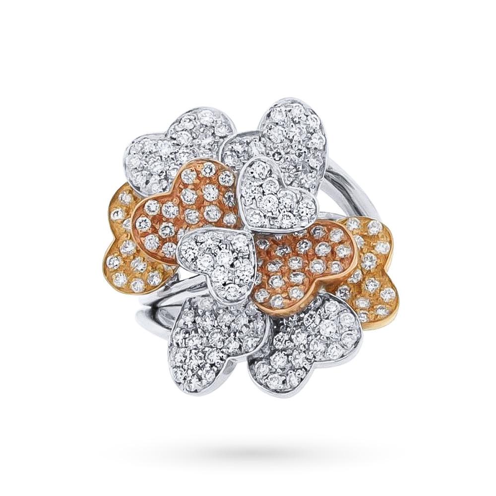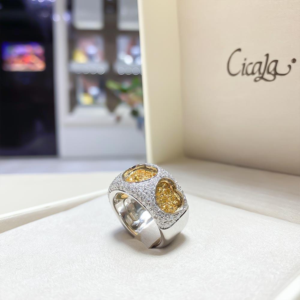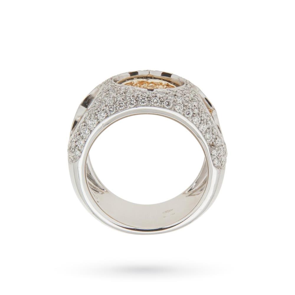 This ring by Giorgio Visconti is made of 18kt white gold. Its peculiarity is the presence, on the upper part, of 3 romantic hearts composed of yellow sapphires, which stand out in the middle of the dense layer of brilliant-cut diamonds. The carats are respectively 0.94 ct of diamonds and 1.35 ct of yellow sapphires. The total weight of the ring is 16.7g, reflecting its size and solidity.