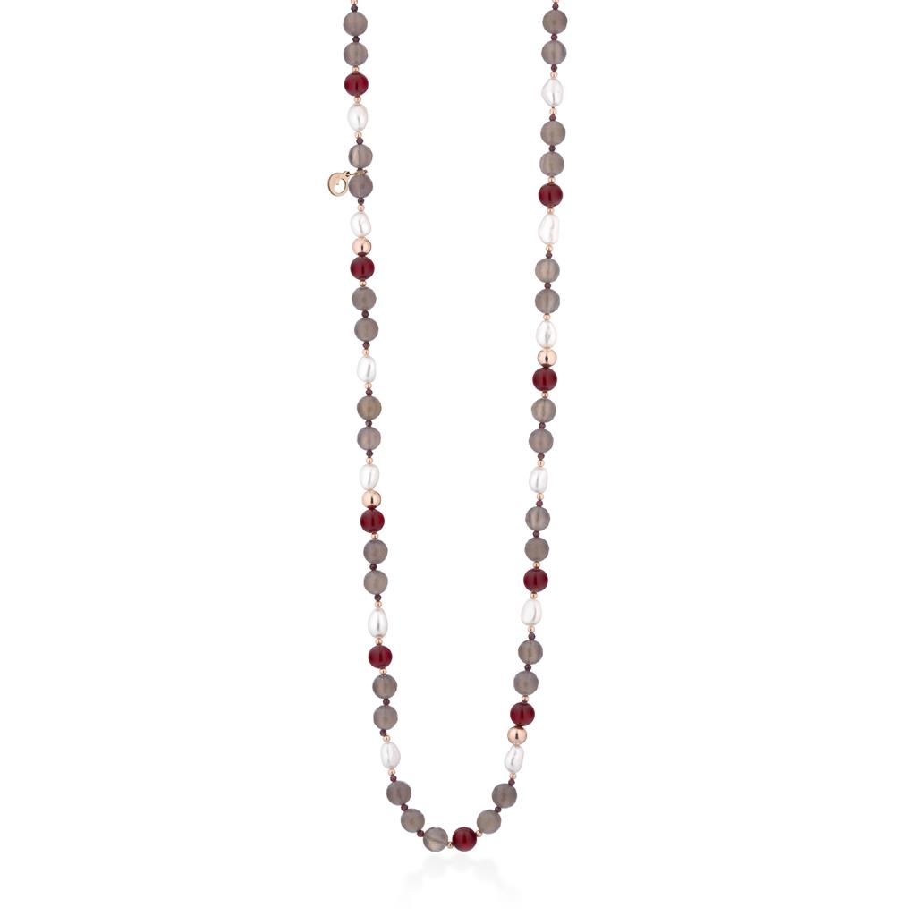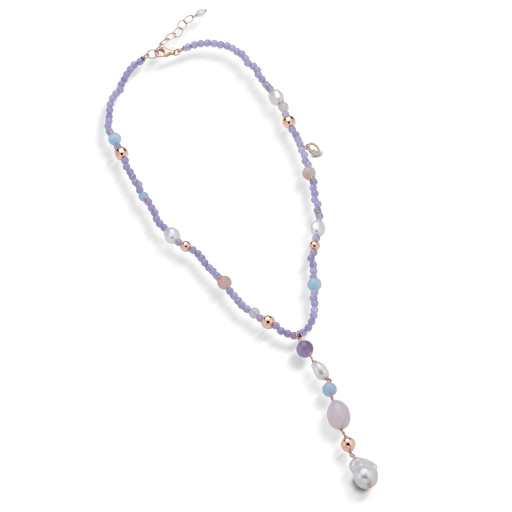 De leLune long necklace with lavender jade, fresh water white pearls, beryl, hematite and silver elements in 925 pink silver