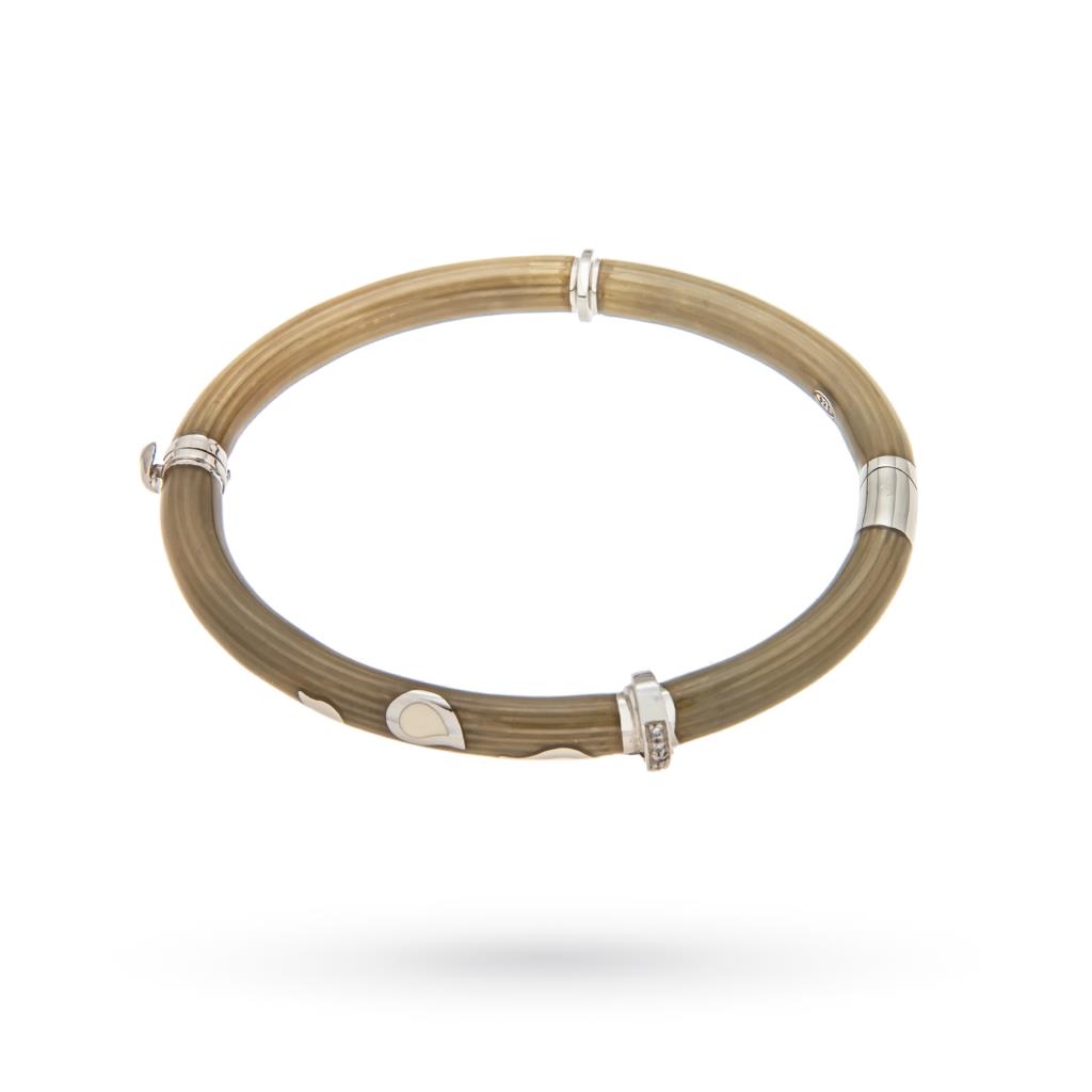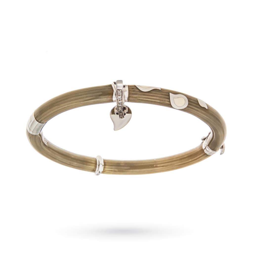 The bracelet is tubular, rigid and green enamelled with a pendant leaf and a small ring in brilliant cut diamonds (total carat 0.04 ct).