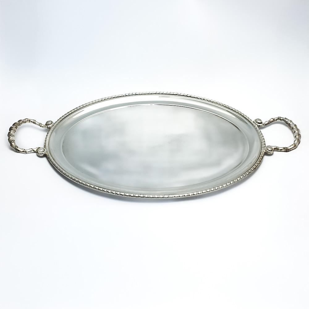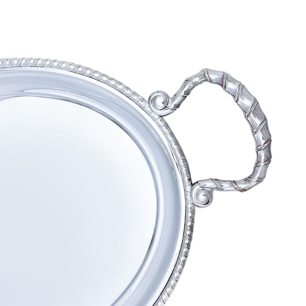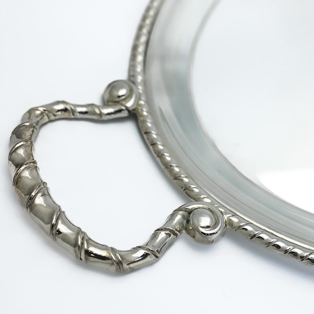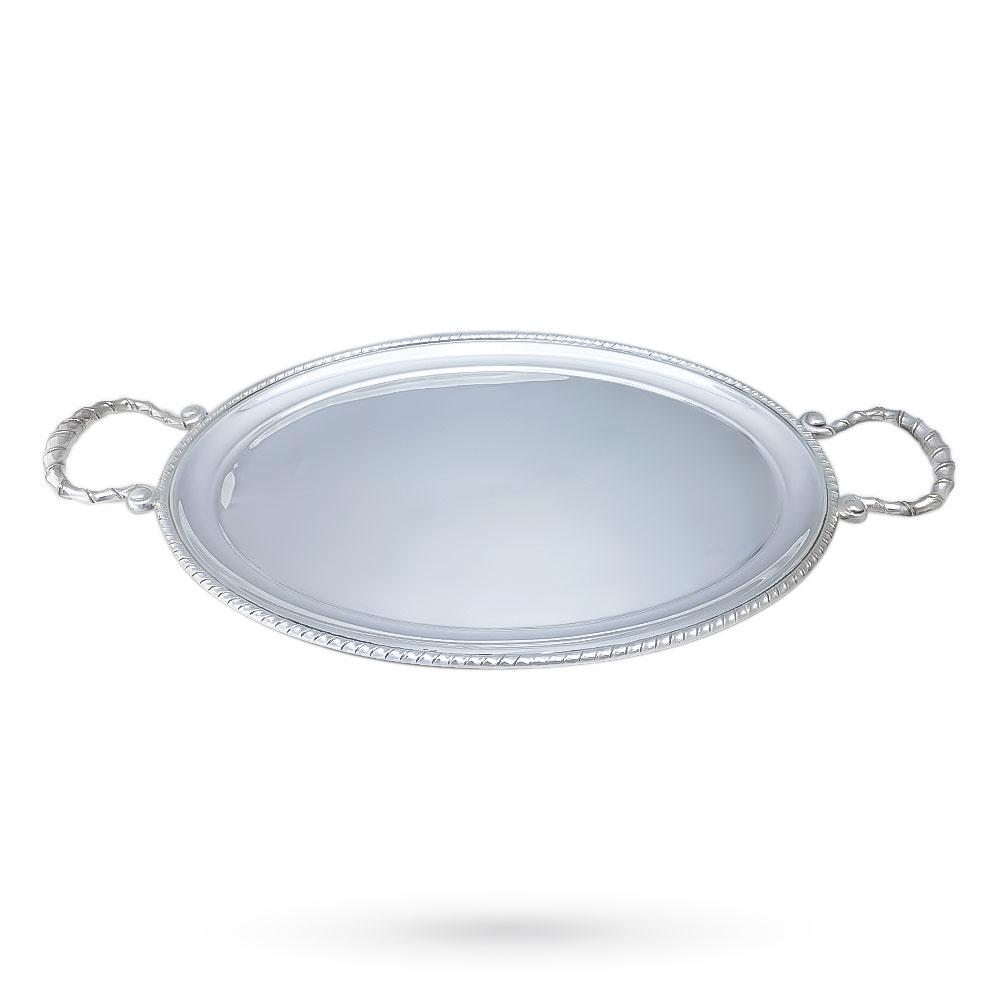 The design features finely crafted twisted handles and a matching decorative border, adding a touch of elegance and uniqueness to the piece. With a smooth surface suitable for engraving, this tray can be personalized to create an exclusive gift or to commemorate special occasions.