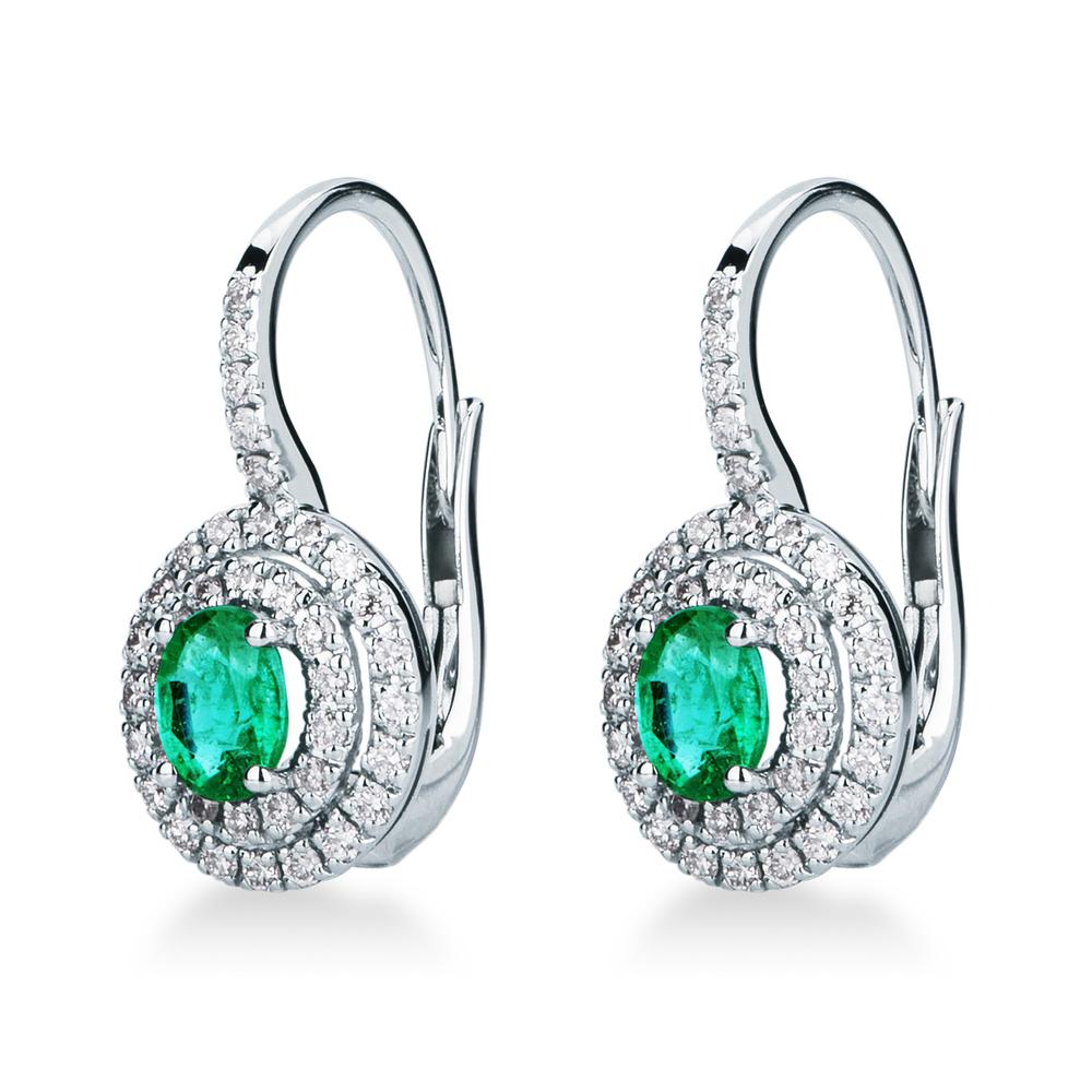 Oval emerald earrings 0.58ct diamonds 0.43ct. These lever earrings are made of precious 18kt white gold. At the center of the creation there are magnificent oval emeralds (total carat weight 0.58ct) with a double outline of brilliant-cut diamonds (total carat weight 0.43ct). The lever closure is practical, solid and resistant. These earrings, given their classic and timeless character, are perfect for wearing every day. They are delivered with box and guarantee signed by Mirco Visconti. At the time of purchase, the Customer is issued insurance against theft, mugging, robbery and fire with a duration of 1 year; Cicala jewelery also offers the customer free shipping insurance on the jewellery. Made in Italy product signed Mirco Visconti reference AB780/S.