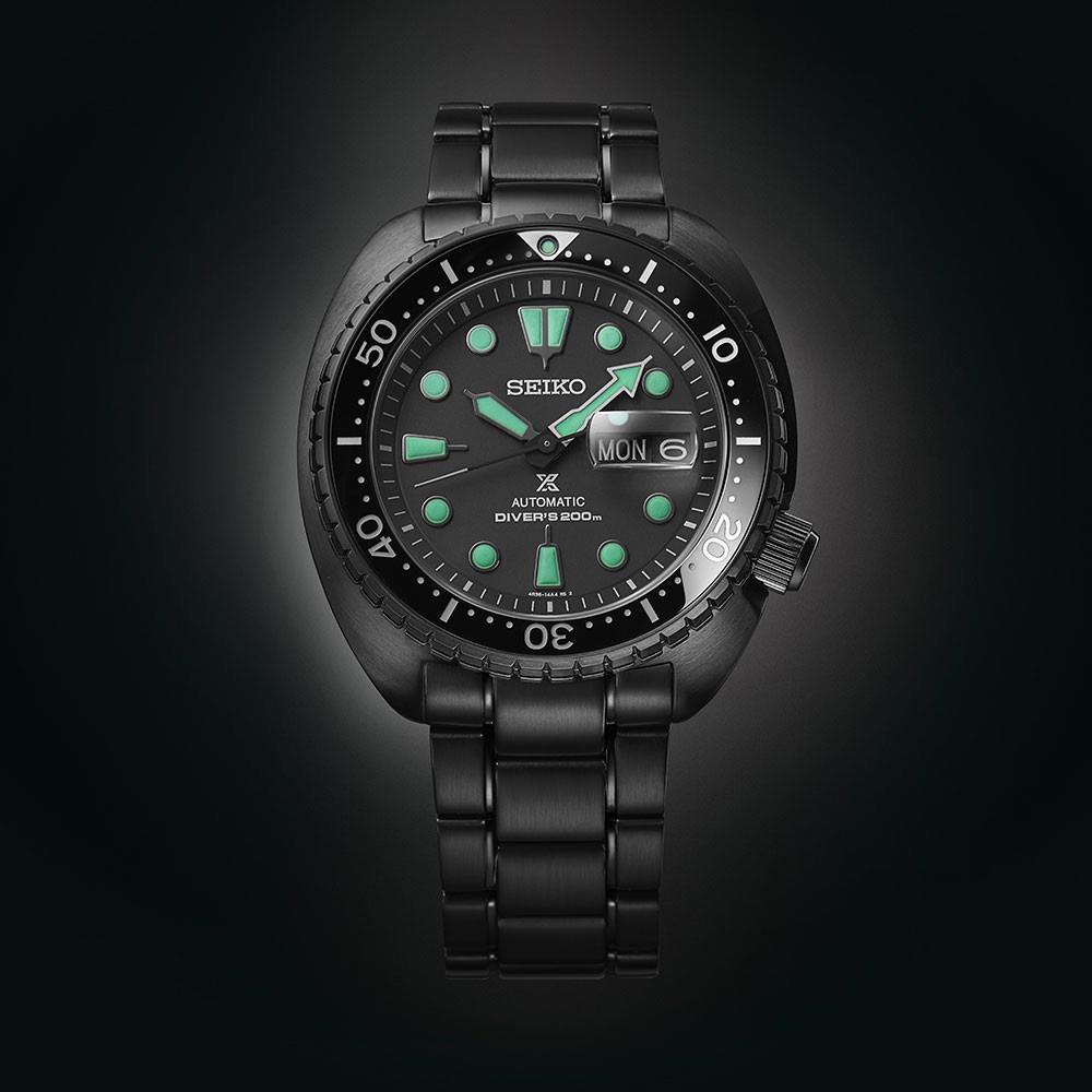 Designed for the high seas, the Prospex SRPK43K1 Night Vision watch is water resistant to 200 meters and will faithfully accompany you on your underwater explorations. This model has a titanium carbonate coated stainless steel case and an anti-reflective sapphire crystal with magnifying glass. The hands and indexes are coated with Seiko Lumibrite Green Pro for professional use. The ceramic bezel gives this solid black watch a luxurious feel.