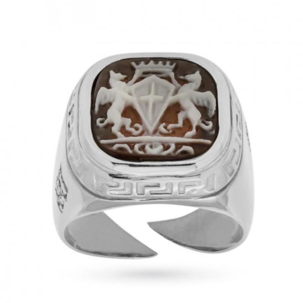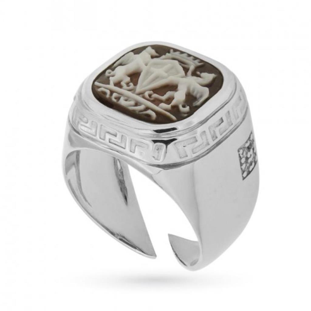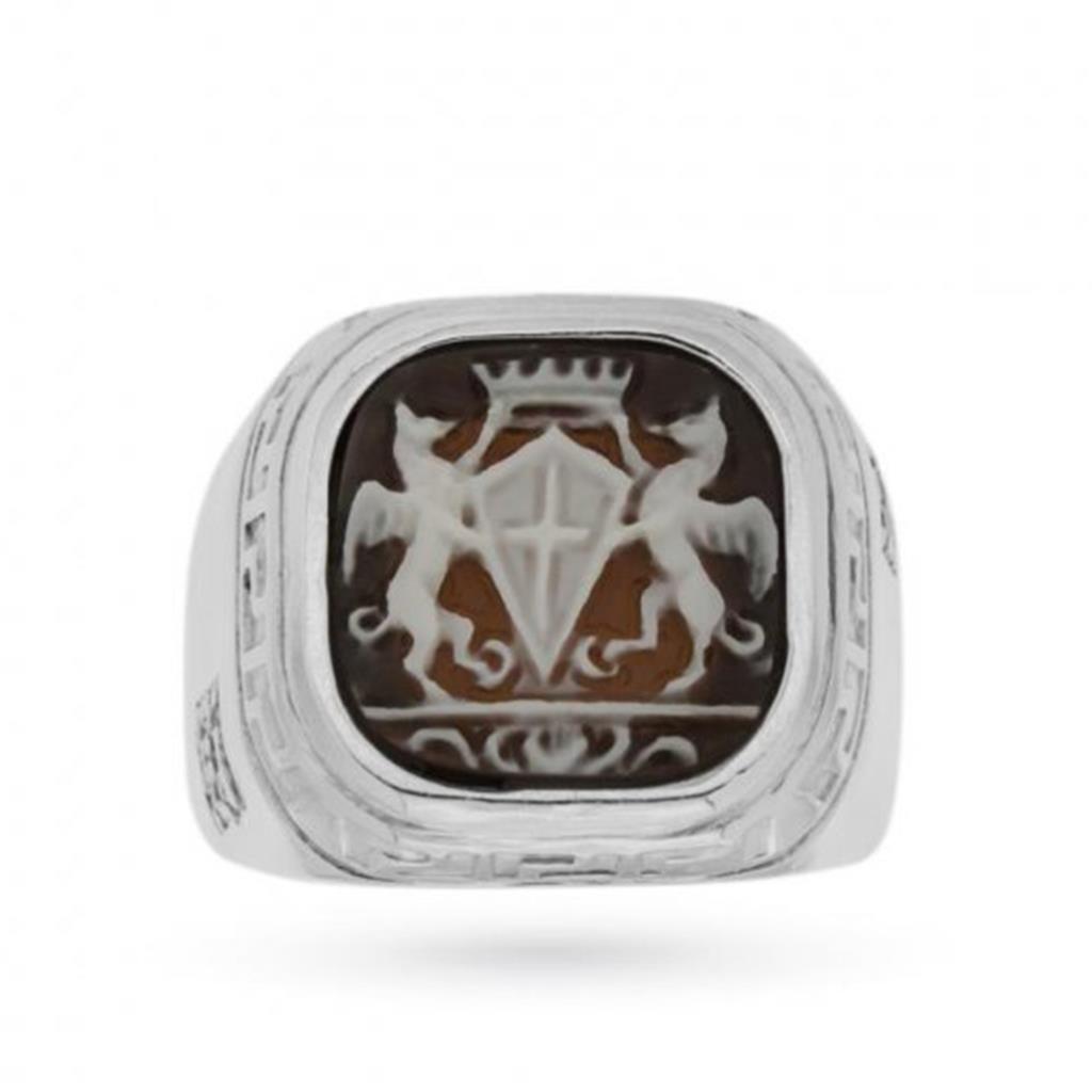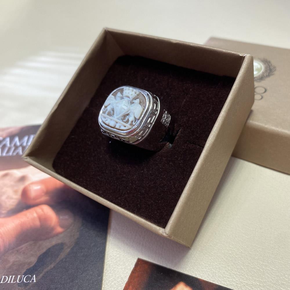 L'anello di Genova è realizzato con una elegante montatura in argento 925 anallergico nickel free con superficie lucida con piccoli zirconi taglio brillante. All'apice del gioiello è presente un particolarissimo cammeo di conchiglia naturale realizzato artigianalmente da maestri incisori a Torre del Greco, in Italia con misure 15,5 mm x15,5 mm circa. Il gambo è aperto e regolabile in autonomia a seconda del dito a cui si desidererà indossarlo, variabile dalla misura 24 alla misura 33.