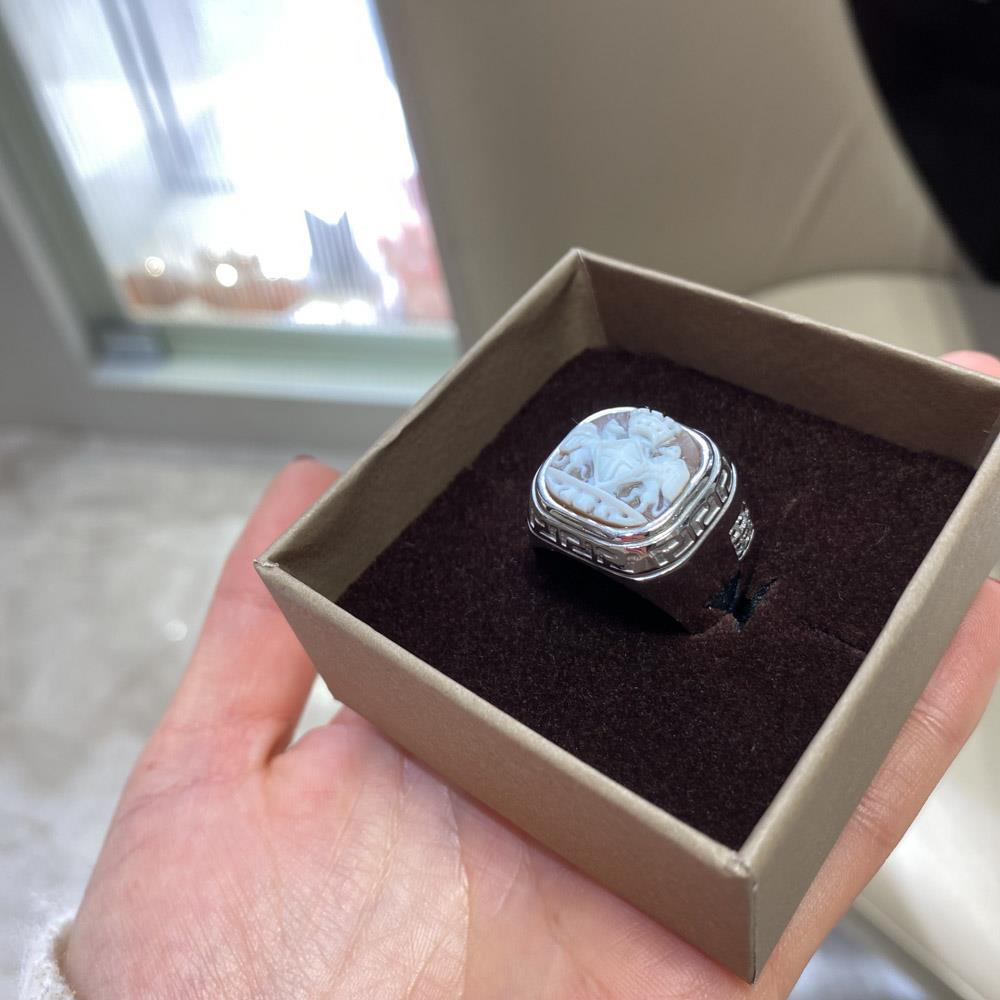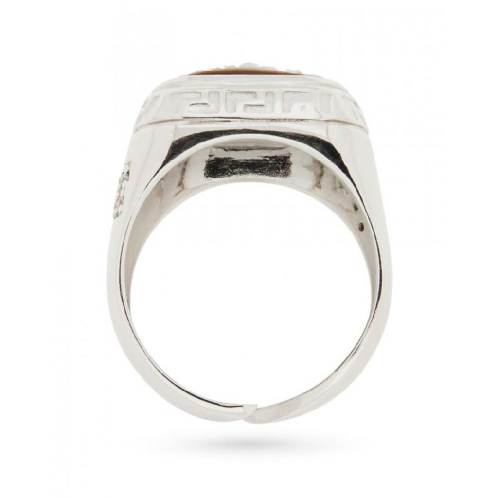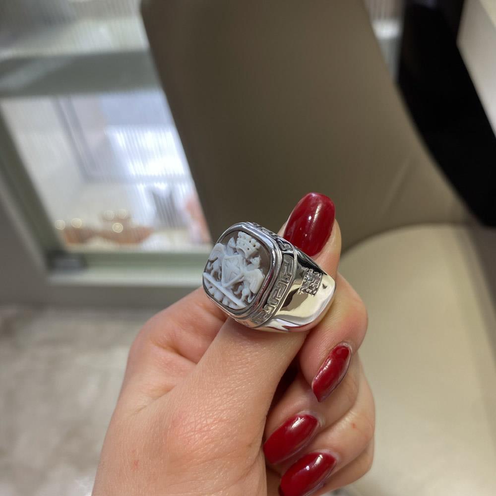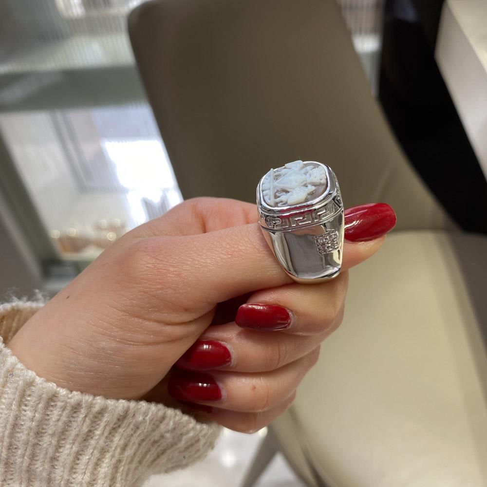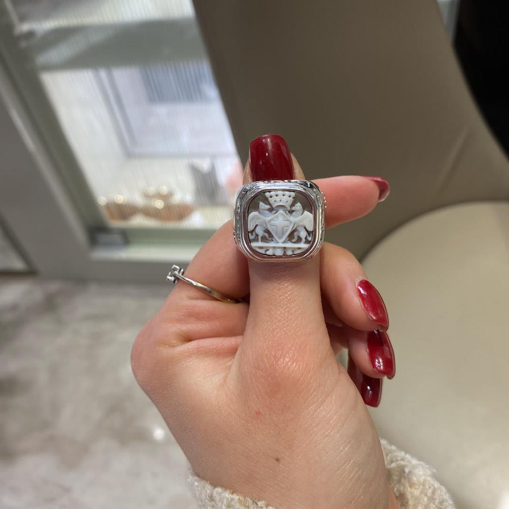 L'anello di Genova è realizzato con una elegante montatura in argento 925 anallergico nickel free con superficie lucida con piccoli zirconi taglio brillante. All'apice del gioiello è presente un particolarissimo cammeo di conchiglia naturale realizzato artigianalmente da maestri incisori a Torre del Greco, in Italia con misure 15,5 mm x15,5 mm circa. Il gambo è aperto e regolabile in autonomia a seconda del dito a cui si desidererà indossarlo, variabile dalla misura 24 alla misura 33.