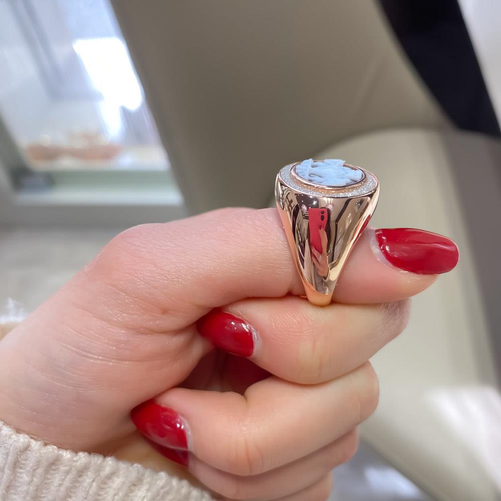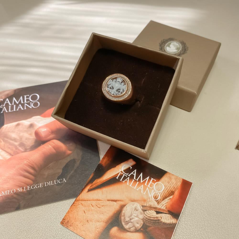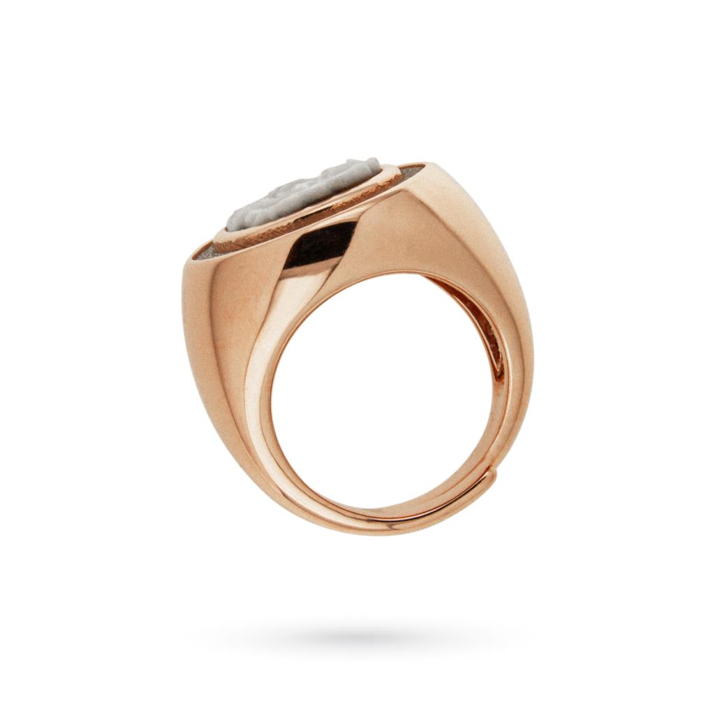 The Genova ring is made with an elegant nickel-free hypoallergenic rose gold plated 925 silver setting with a shiny surface with small brilliant-cut zircons. At the apex of the jewel is a very special natural shell cameo handcrafted by master engravers in Torre del Greco, Italy. The stem is open and independently adjustable according to the finger on which you want to wear it. The central cameo has a diameter of approximately 3.9 mm.