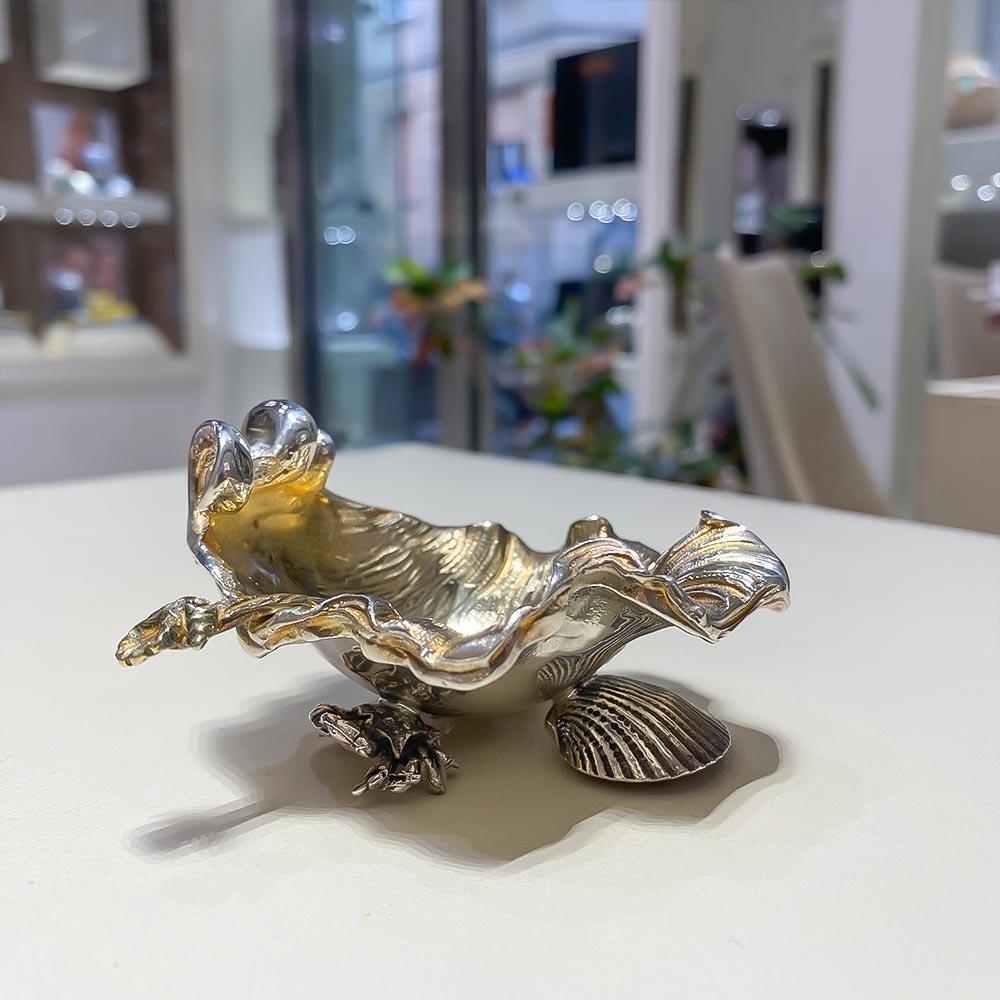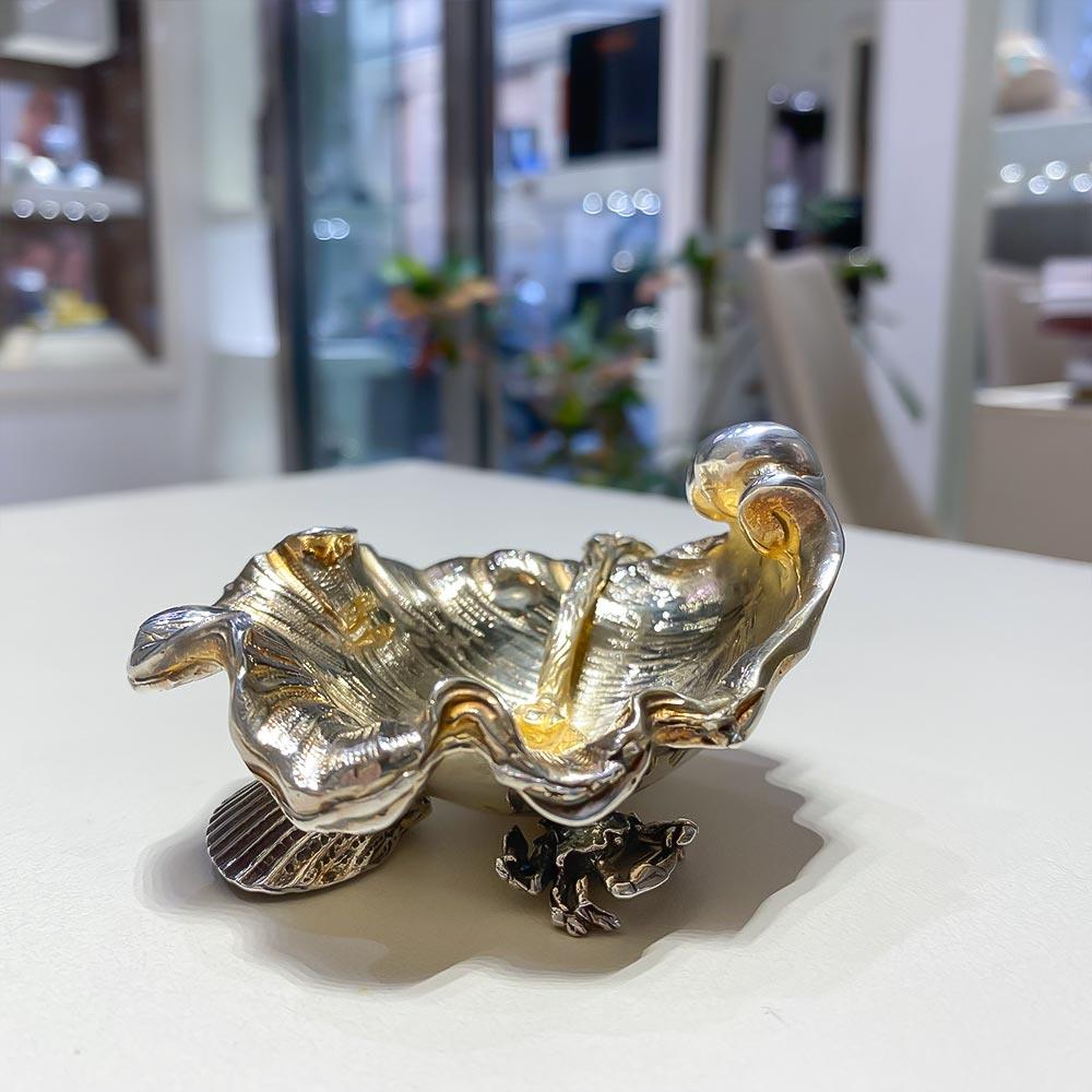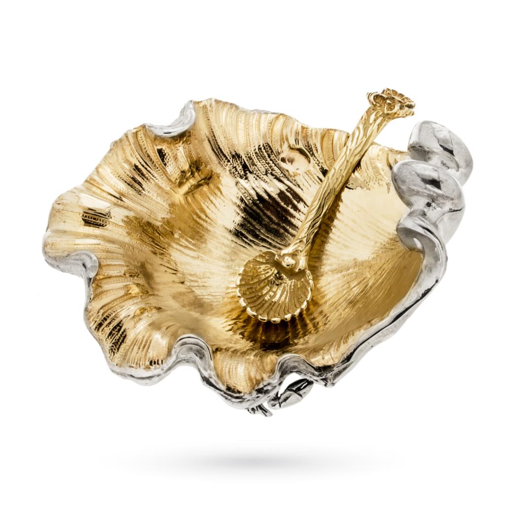 It has the shape of an oyster and is embellished internally with an elegant gilding.
