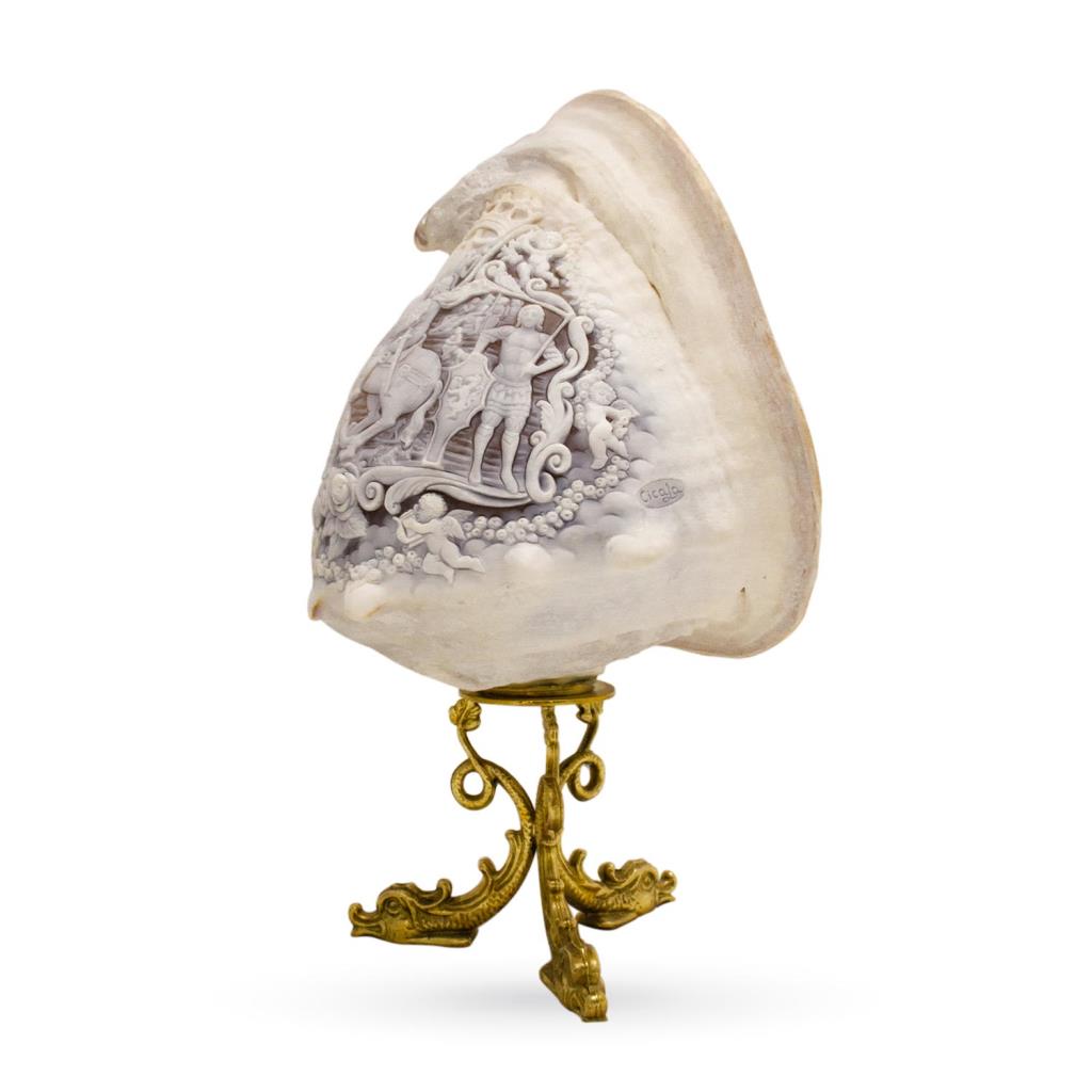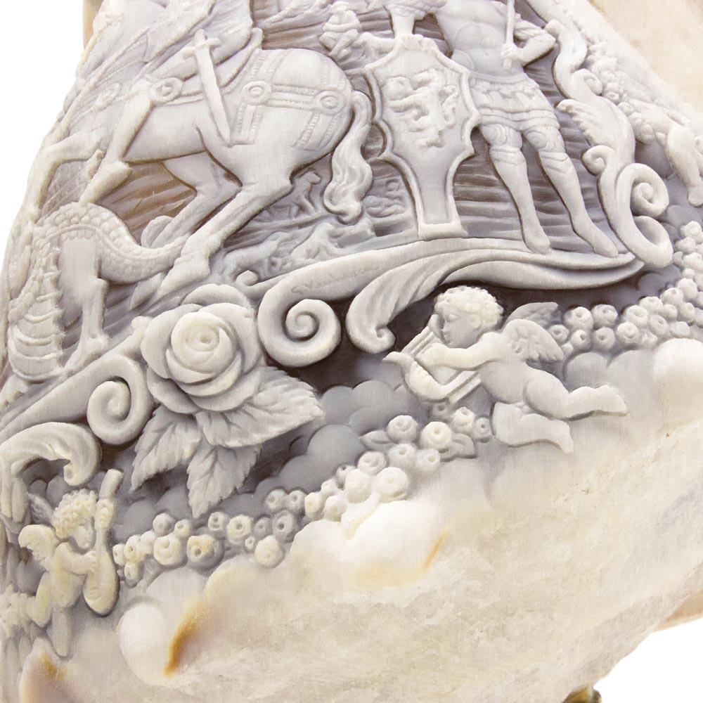 St. George and the Dragon ornament lamp in engraved shell cameo. This extraordinary ornament lamp is made from a natural shell, entirely hand-engraved by Maestro Giovanni Ventresca, one of the most renowned cameo engravers in Torre del Greco, in the province of Naples. The subject depicted is St. George, patron saint of Genoa, immortalized in the heroic act of fighting the dragon, an iconic scene that symbolizes the eternal struggle between good and evil. The engraving is a faithful reproduction of an ancient stone portal located in the alleys of Genoa's old city, opposite the Abbey of St. Matthew.