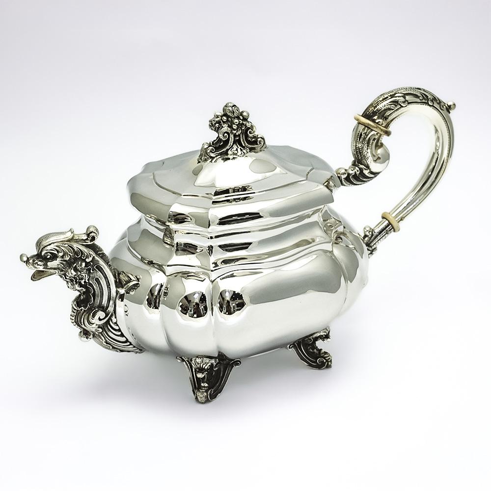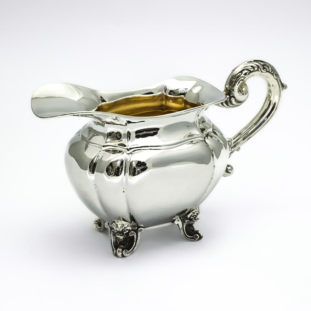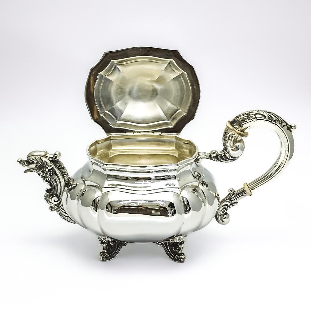 The teapot, designed with elegance and functionality, features ivory insulators for safe handling. It measures 33 x 17 cm, stands 19 cm tall, and weighs 903 grams. The sugar bowl, measuring 20 x 12 cm with a height of 15 cm, weighs 537 grams and harmoniously complements the other pieces in the set. The creamer, with dimensions of 20 x 9 cm and a height of 11 cm, weighs 307 grams.