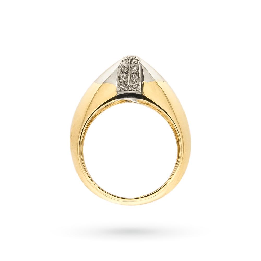 A jewel that blends vintage style and innovative design: this refined band ring, made of fine 18kt yellow and white gold (750/000), stands out for its exclusive cone design and the presence of brilliant-cut diamonds masterfully set on both sides of the jewel.