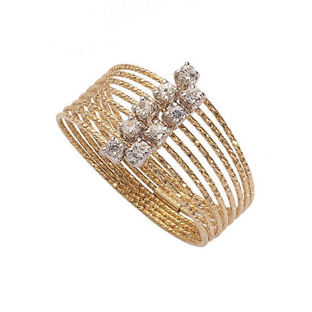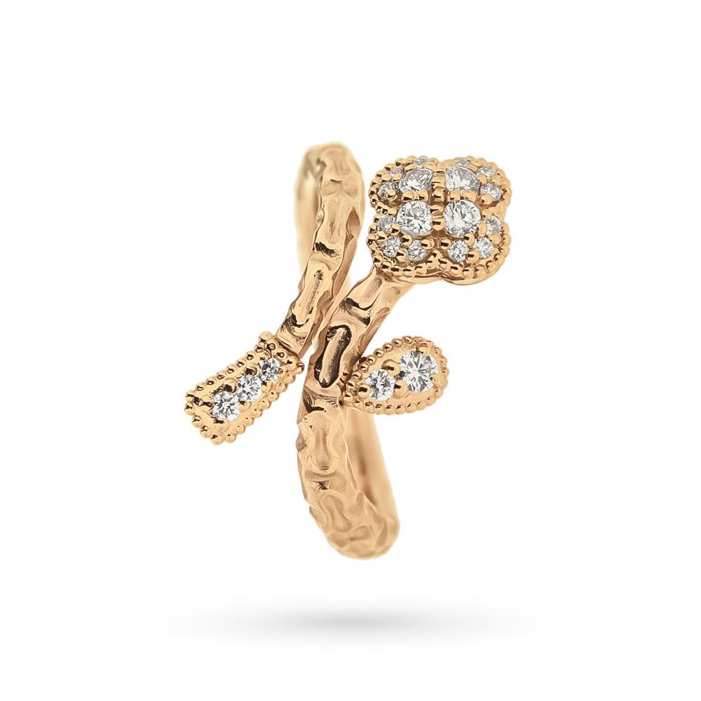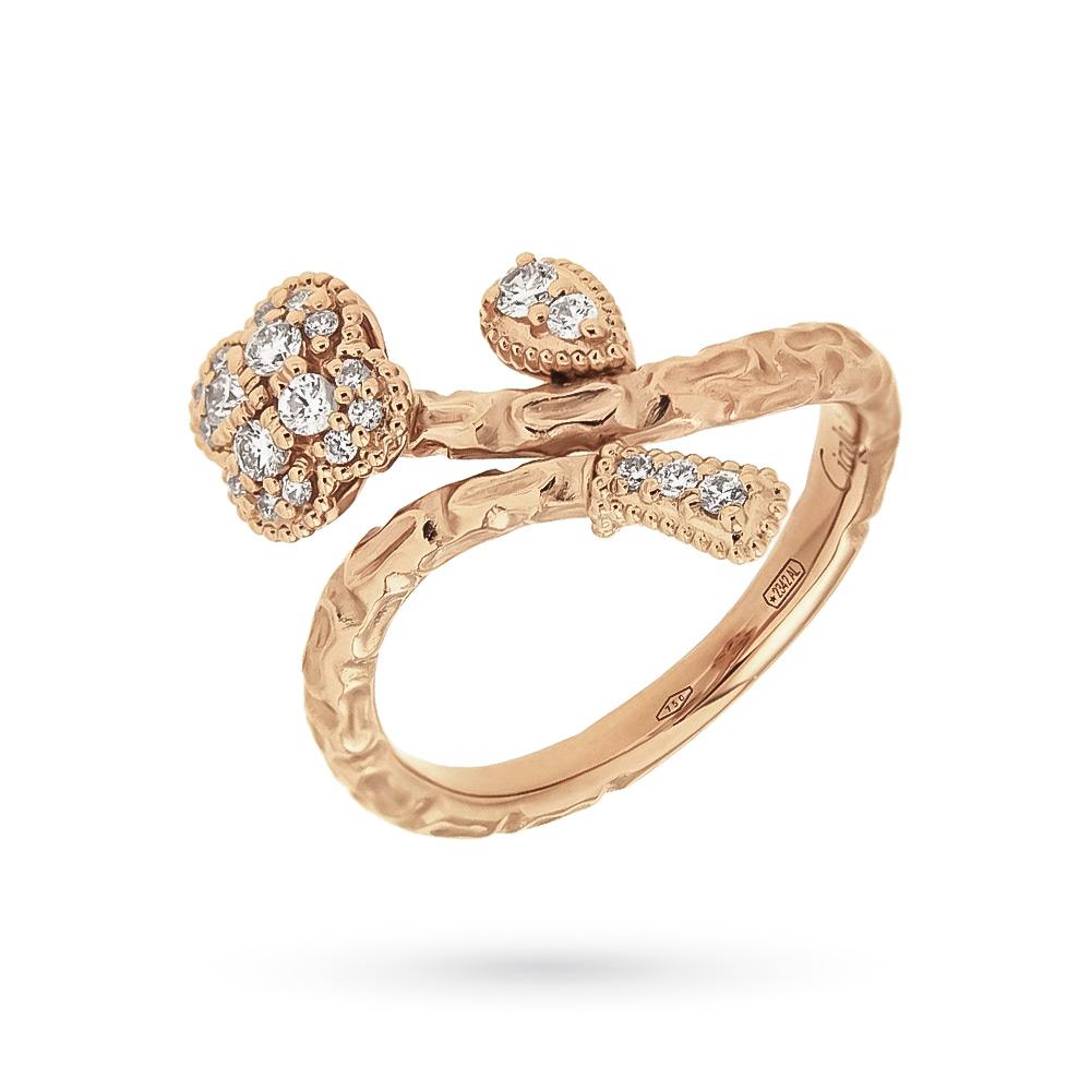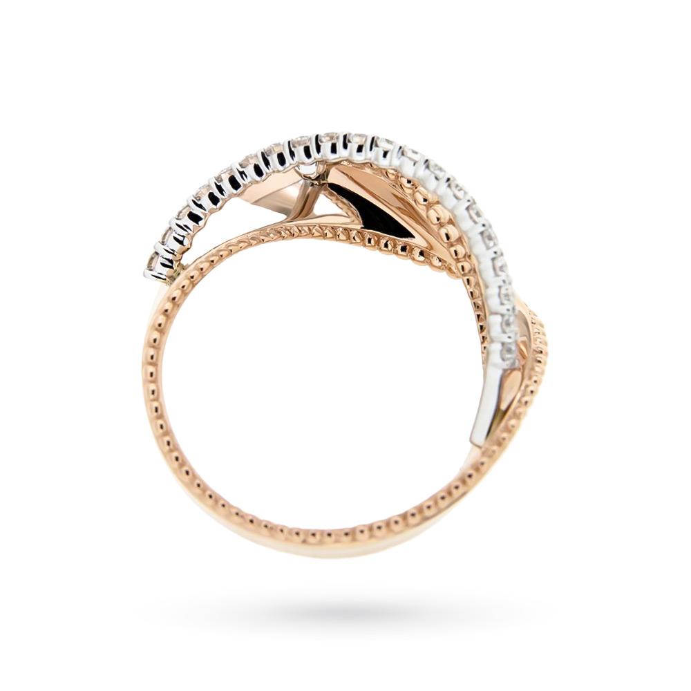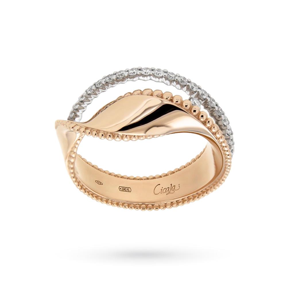 This extraordinary ring by Oro Trend is a unique, handcrafted creation made from 18kt white and rose gold, crafted to mimic the softness of fabric. The distinctive gold folds create spectacular beams of light, giving the ring unparalleled elegance. The design is further enhanced by a delicate line of diamonds, with a total weight of 0.29 ct, set on a white gold base that perfectly highlights the brilliance of the gems. An elegant choice for those seeking an original and precious piece, ideal for celebrating unforgettable moments.