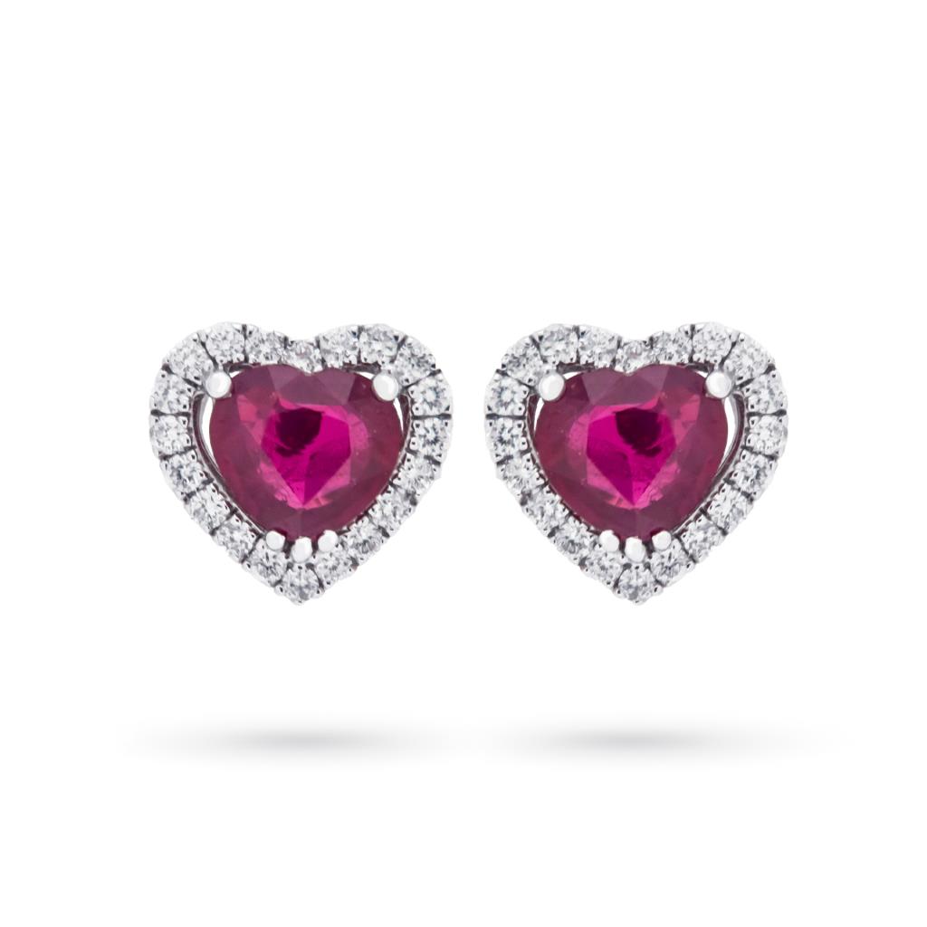 Ruby earrings hearts 0.88ct diamonds 0.28ct Mirco Visconti. The earrings you are looking at are a Made in Italy creation by Mirco Visconti. Each earring is made up of a heart-cut red ruby surrounded by two rows of brilliant-cut diamonds. Each ruby has a carat weight of 0.44ct (0.88ct total) and the diamonds have a total carat weight of 0.28ct. The jewel is accompanied by a certificate and official brand box. Furthermore, with the purchase a one-year insurance policy is activated against theft, theft, robbery and fire. The Cicala jewelery shop also offers free insurance coverage on the shipment of the jewel.