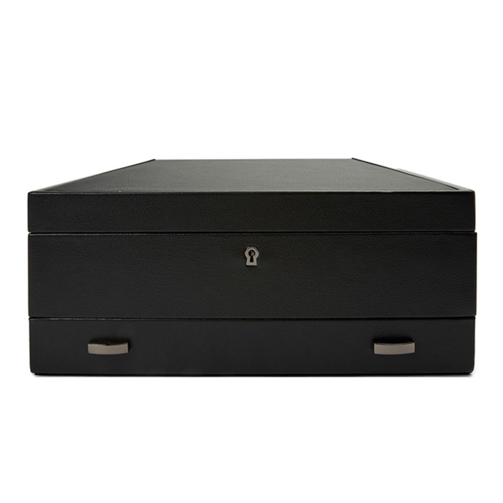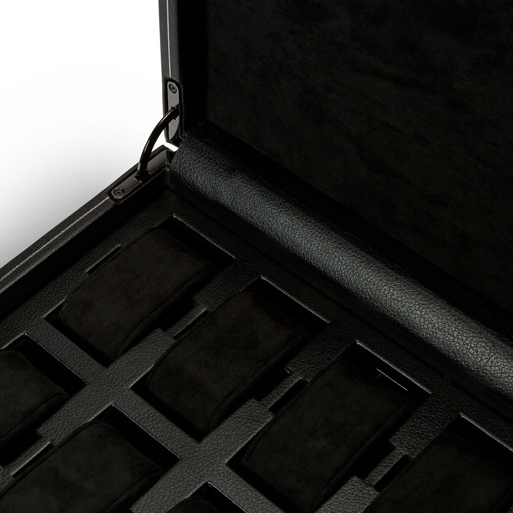 British Racing 10 Piece Watch Box with Drawer - Color: Black. Product dimensions (in): 13 x 9 x 6. Weight (lbs): 6. Brand: Wolf. Classics are not created, they are born, destined to be one-off’s, different, unique and above all else, timeless. British Racing has, in a very short span of time, become a classic, truly one of a kind. Protect your watches in style in our 10 piece watch box with storage. Material: Vegan Leather.