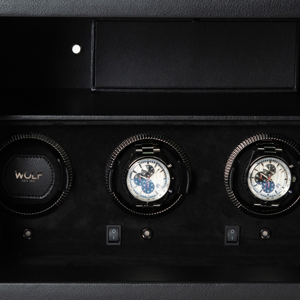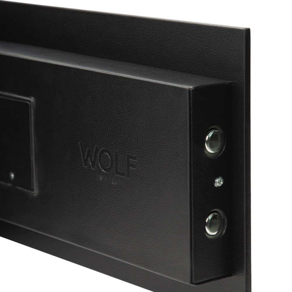 The Den 4 Piece Safe - Color: Black. Product dimensions (in): 19.5 x 13 x 11. Weight (lbs): 47. Brand: Wolf. The Den safe has a vegan leather covered exterior and features four patented WOLF watch winders with storage space above including a Vault Tray with removable 3-piece watch tray. The door of The Den opens and locks with a biometric identifier or keycode.
