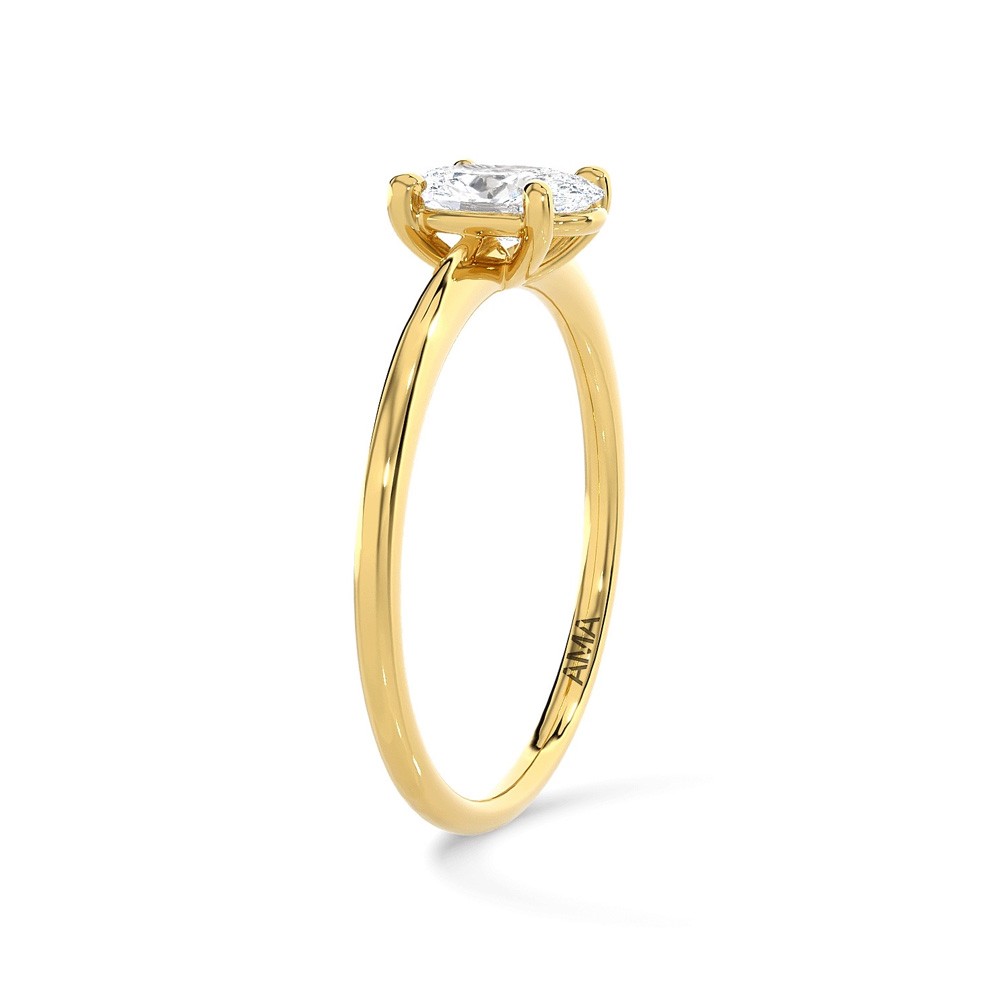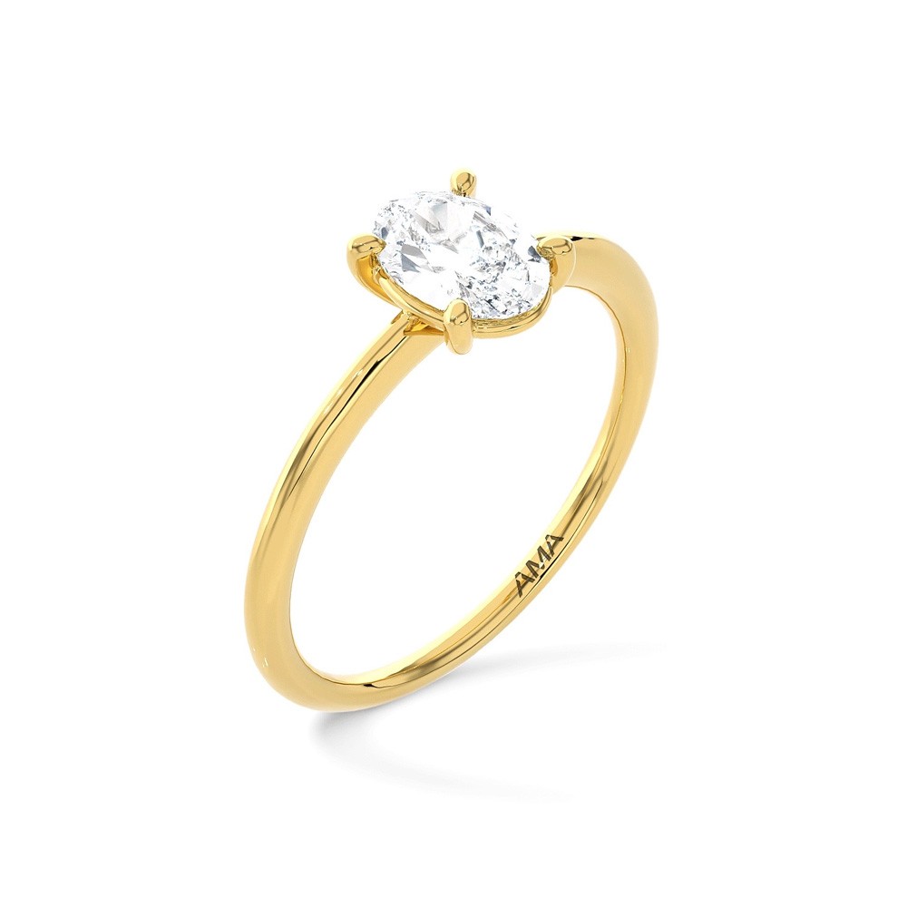 This ring, crafted from 18KT recycled yellow gold, features a 1.00-carat oval-cut AMA diamond. AMA diamonds are man-made diamonds with F (or better) color and VS (or better) clarity. All unpierced diamonds over 0.50 carats are accompanied by an IGI certificate. If the diamond's carat weight is unavailable, it may be substituted with a diamond of a higher carat weight. The jewelry store offers complimentary shipping insurance.