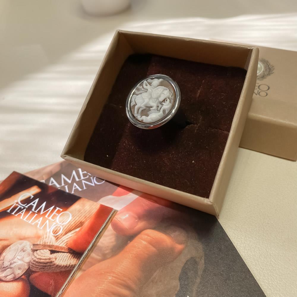 L'anello di Genova con inciso San Giorgio che uccide il Drago è un omaggio di Cicala a tutti gli amanti della città , ma non solo... Questa creazione infatti simboleggia la forza del bene (San Giorgio) contro il male (il Drago). La montatura dell'anello è realizzata in argento 925 nickel free anallergico con brunitura superficiale, per mettere in risalto il cammeo centrale inciso a mano, con dimensioni diametro di circa 20mm. Data la manualità dell'incisione ogni anello è diverso da ogni altro. Il gambo aperto consente di regolare la misura autonomamente a seconda del dito a cui si desidera indossarlo, che può variare dalla misura 16 alla 23.