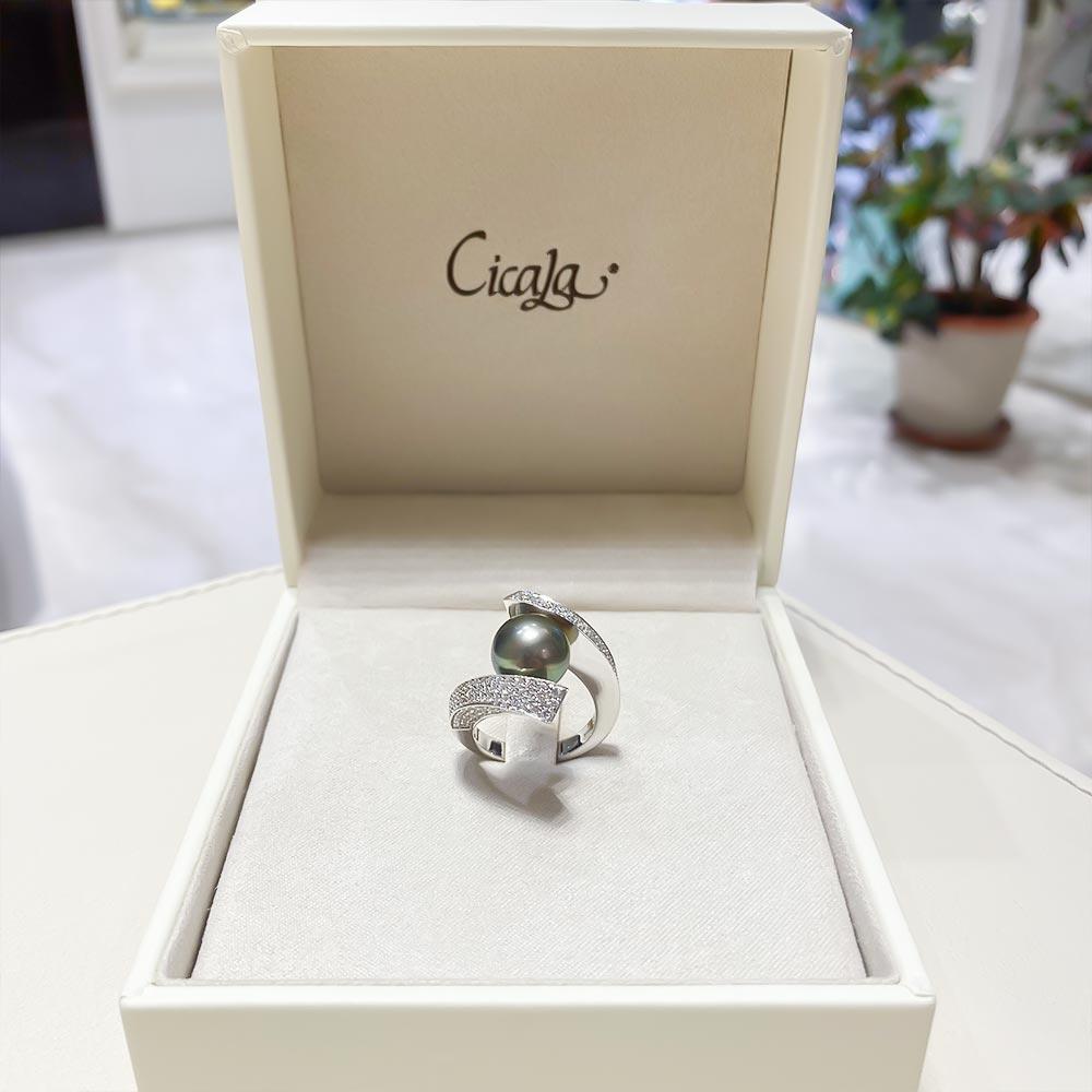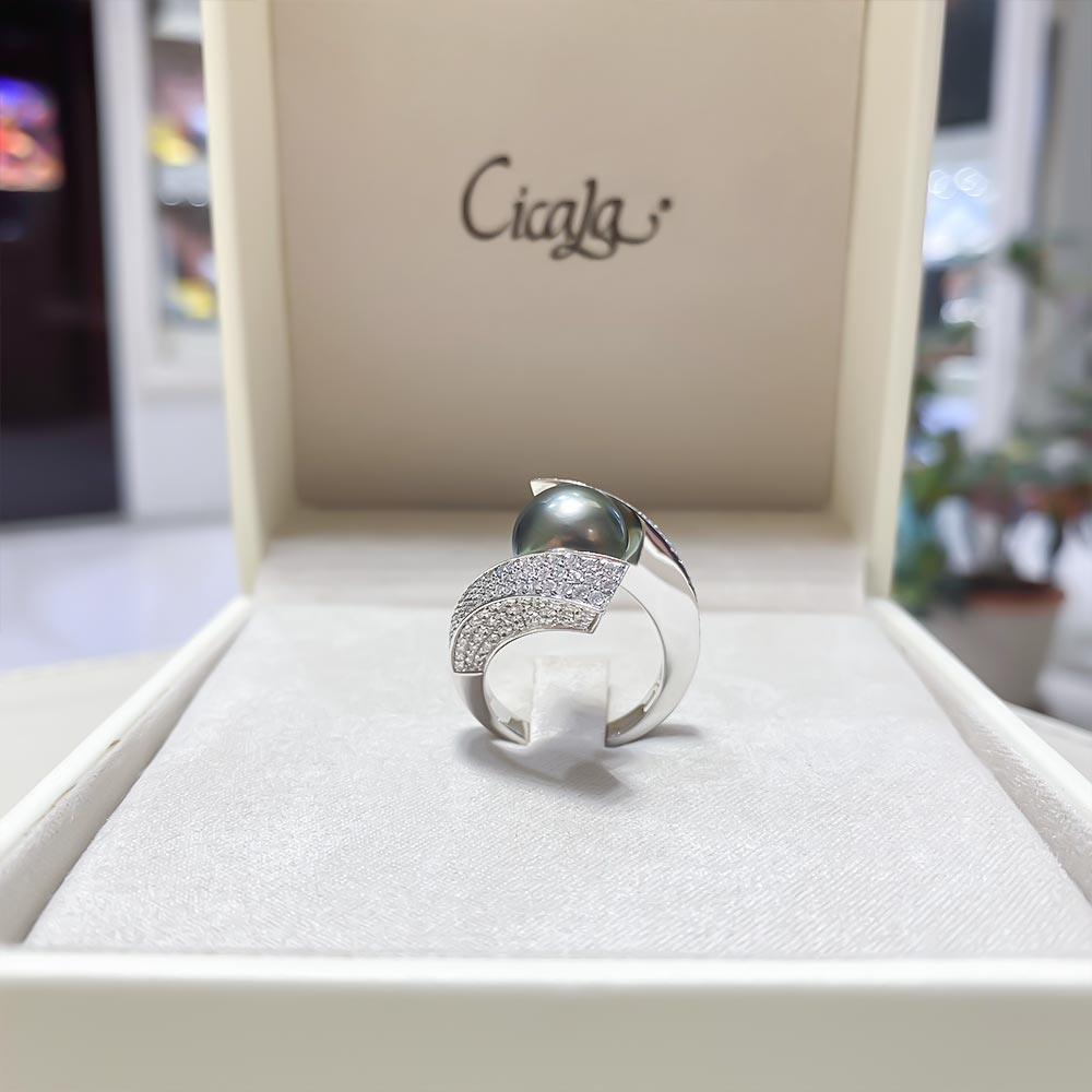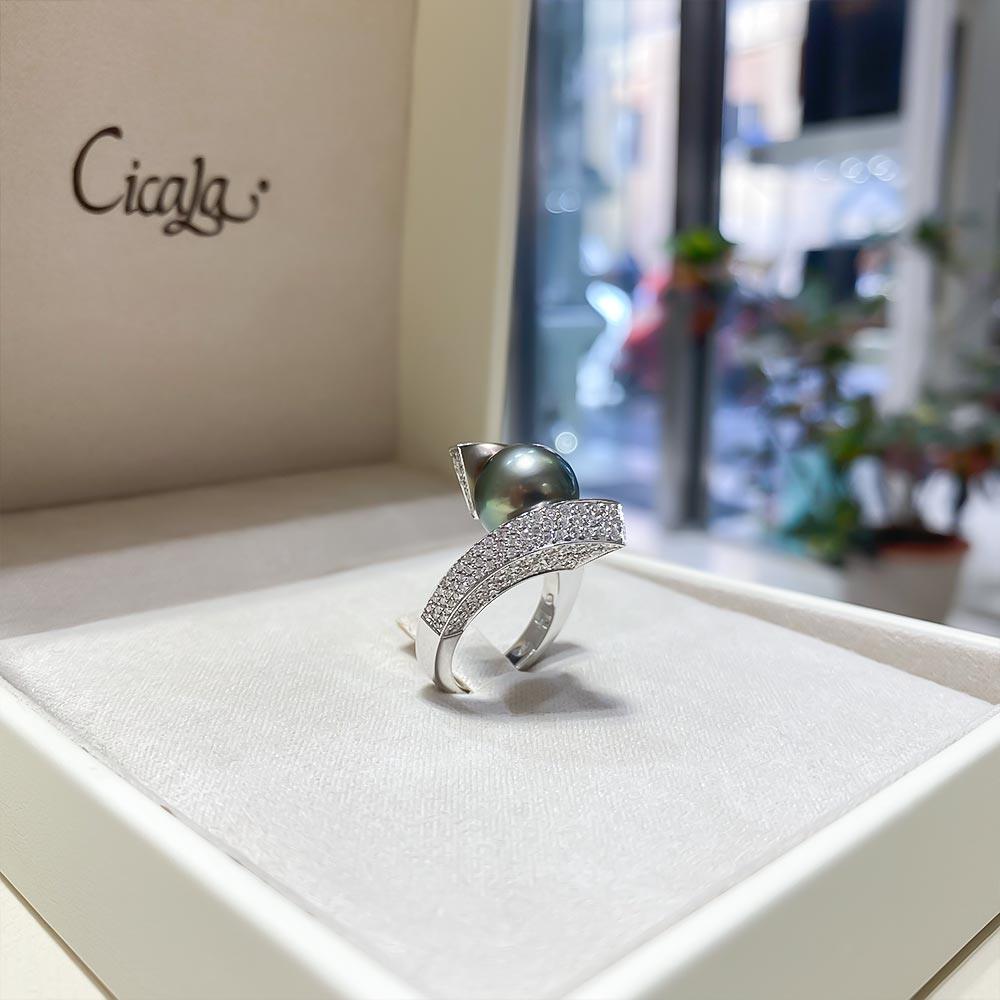 Anello perla nera oro bianco e pavè di diamanti 1,41ct.