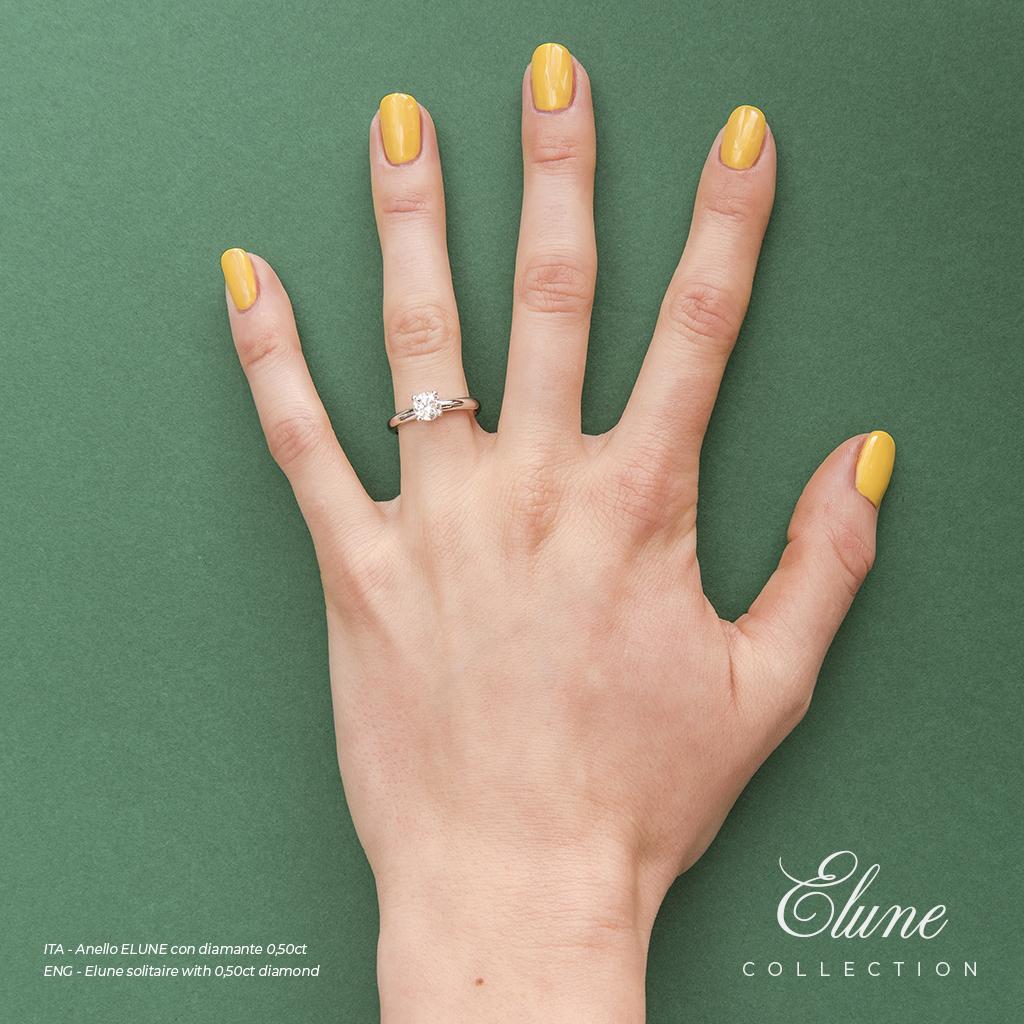 L’anello Elune è un’icona di stile, ed è uno tra gli anelli più famosi per le proposte di matrimonio. La sua bellezza deriva dalla montatura in pregiato oro bianco 18kt morbida ed avvolgente e dai piccoli diamantini posti sotto al diamante solitario centrale, un diamante taglio brillante con colore D e purezza VS.
