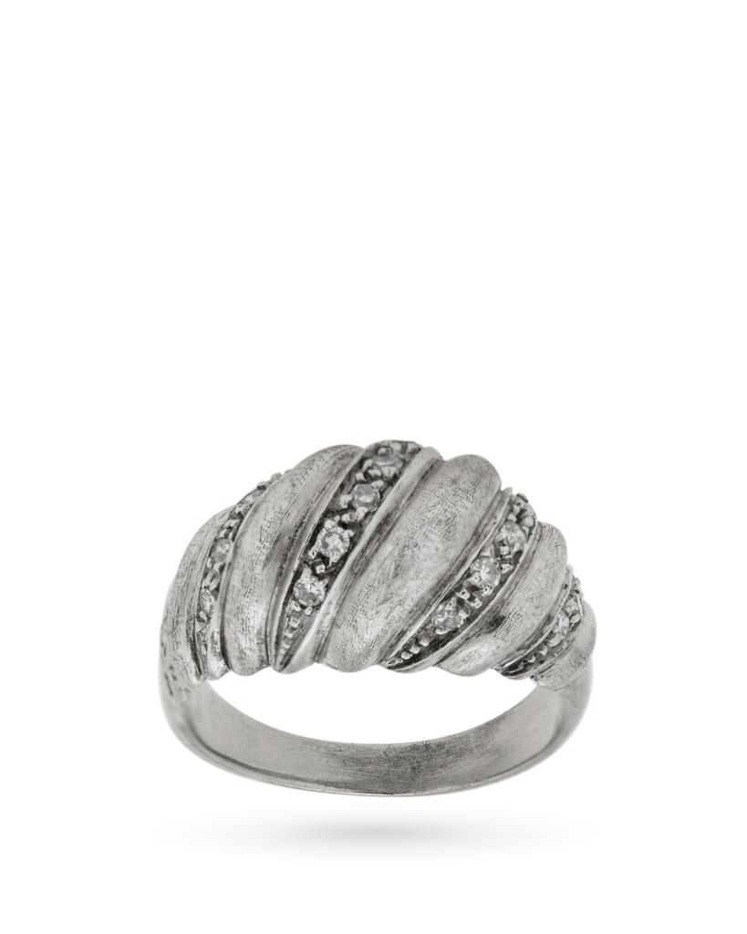 Il gioiello che stai osservando è un anello in oro bianco 18kt a fascia larga con superficie satinata e martellata.