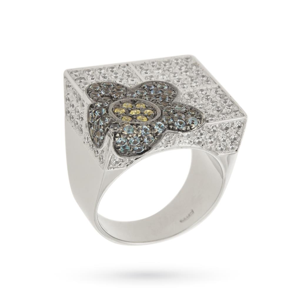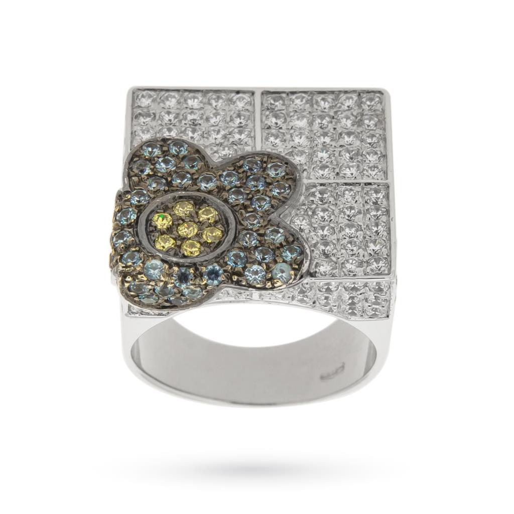 Anello oro bianco 18kt fiore zirconi bianchi colorati
