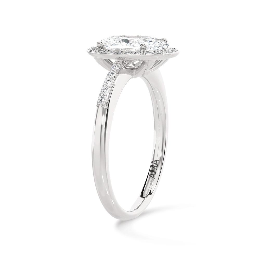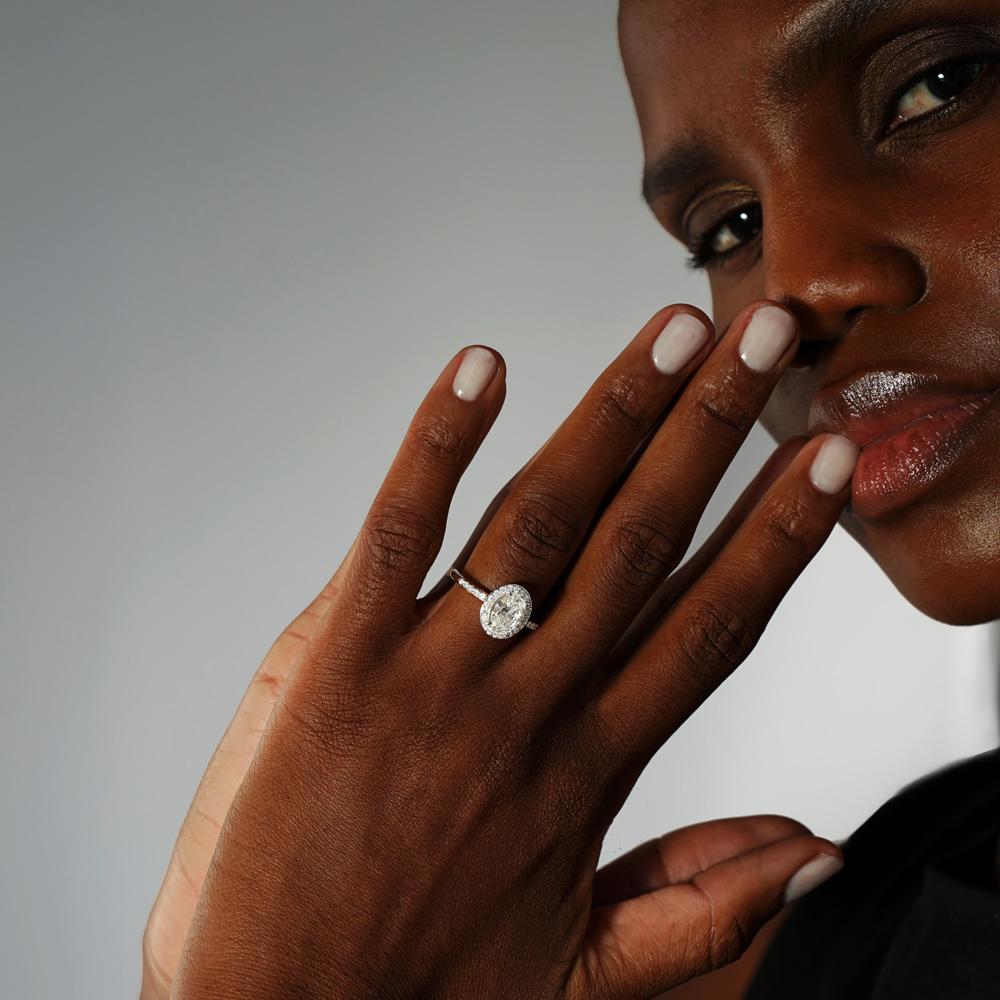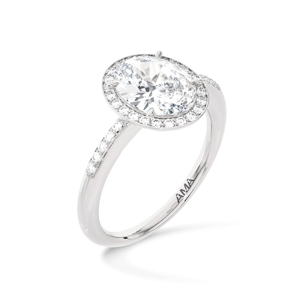 Questo anello realizzato in oro bianco riciclato 18 KT incastona 1 diamante AMA taglio ovale da 2 ct e 32 diamanti AMA taglio brillante da 0.01 ct per una caratura totale di 2.32 ct. I diamanti AMA sono diamanti creati dall'uomo di colore F (o superiore) e purezza VS (o superiore). Tutti i diamanti superiori a 0,50 ct, se non forati, sono accompagnati da certificato IGI. Qualora la caratura del diamante non fosse disponibile potrebbe essere sostituito da un diamante di caratura superiore. La gioielleria omaggia una copertura assicurativa sulla spedizione del gioiello.