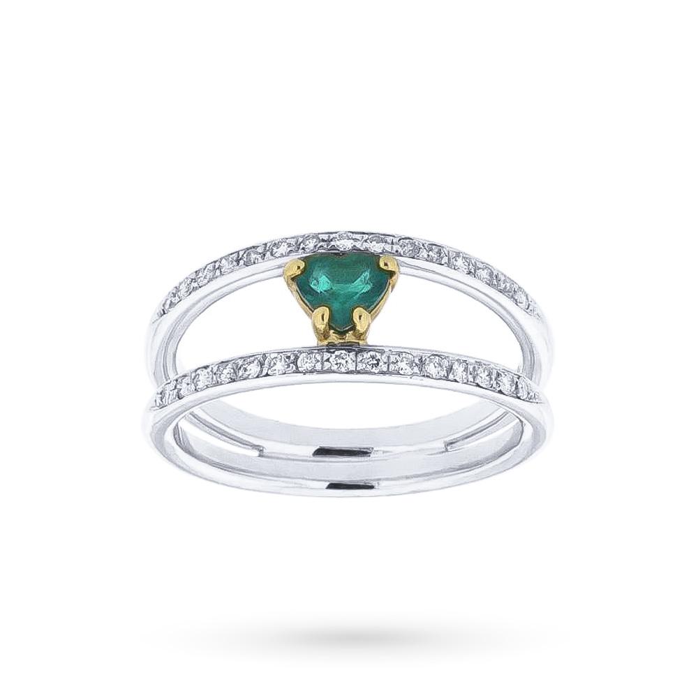 Anello oro bianco cuore smeraldo 0,31ct diamanti 0,30ct. Ecco un piccolo capolavoro per tutti gli amanti degli smeraldi. Questo anello firmato Cicala è un piccolo anello da indossare tutti i giorni grazie al suo design fresco e semplice. Il gioiello è realizzato in elegante oro bianco 750/000 (18kt) con finitura lucida. La sua particolarità è data dal gambo, che si divide in due, abbellito da piccoli diamanti con taglio brillante (totale diamanti 0,20ct). Le due parti della montatura sono unite dallo smeraldo con taglio a cuore (peso: 0,31ct), sostenuto e reso solido da preziose griff in oro giallo 750/000 (18kt). Un gioiello esclusivo e unico firmato Cicala.