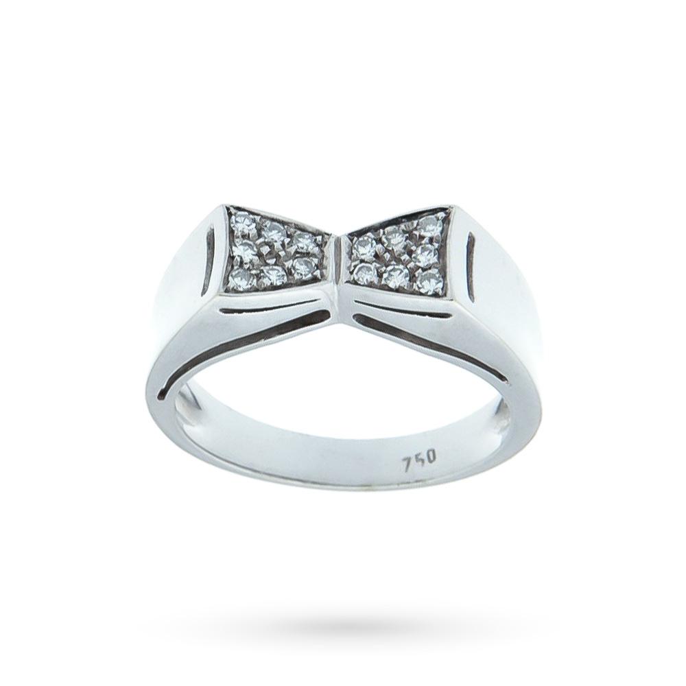 Anello oro bianco fiocco diamanti 0,14ct. Il gioiello che stai osservando è un anello in oro bianco 18kt (750/000) che rappresenta un fiocco con pavè di brillanti. E' un anello discreto ed elegante, perfetto da indossare tutti i giorni. La misura è 14. (17,20mm) L'anello è personalizzabile con incisione all'interno del gambo ed è possibile effettuare la messa a misura della dimensione desiderata. L'articolo è accompagnato da un elegante confezione originale del brand e da garanzia di autenticità dei materiali.
