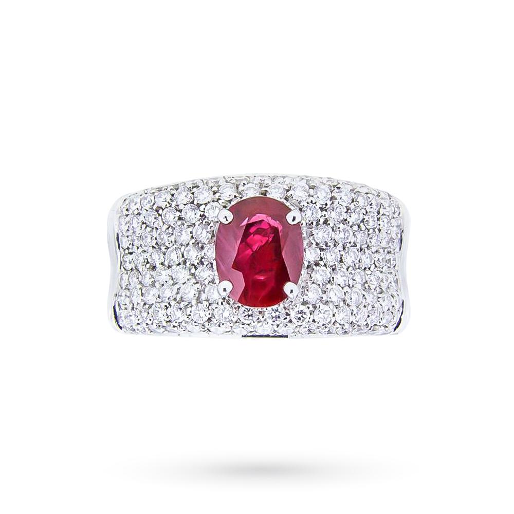 Anello oro bianco rubino 1,13ct pave diamanti 1,03ct. Questo anello a fascia con rubino è realizzato interamente in oro bianco 18kt. La superficie superiore del gambo è impreziosita da un pavè di diamanti. La caratura complessiva dei diamanti è 1,03ct con colore G e purezza VS. Al centro è presente un magnifico rubino color rosso intenso ovale da 1,13ct. Il gambo consente, su richiesta, l'incisione di un nome o una data. E' accompagnato da scatola e garanzia.