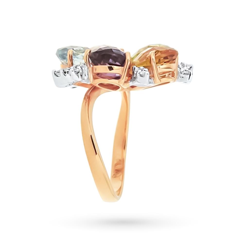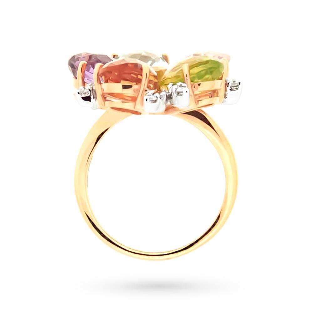 Anello oro rosa 18kt fiore gemme multicolor diamanti 0,35ct. Il prezioso anello che stai osservando è realizzato in oro rosa e oro bianco 18kt. E' composto da una raffinato gambo d'oro rosa 18kt, discreto e luminoso. Al centro del gioiello è presente un fiore d'oro rosa e bianco 18kt. I petali del fiore sono composti da 5 gemme con taglio a goccia: topazio azzurro, peridoto, ametista, topazio rosa e topazio giallo. Al centro del fiore è presente un diamante taglio brillante. Piccoli diamanti impreziosiscono anche le foglioline poste a contorno della creazione.