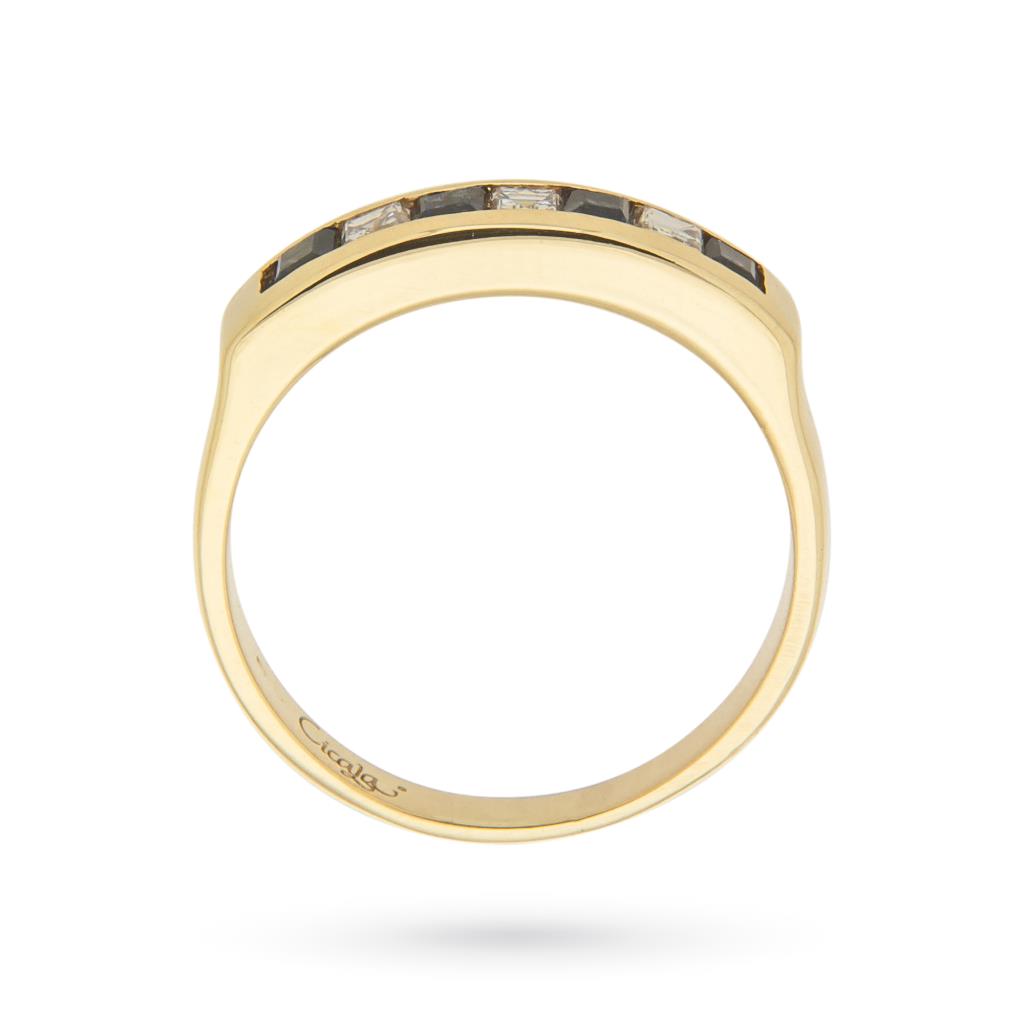 Regala o regalati un simbolo di eleganza e stile con questo anello a riviera in oro giallo con zaffiri e diamanti. Un gioiello Made in Italy che racchiude lusso, raffinatezza e un fascino senza tempo.