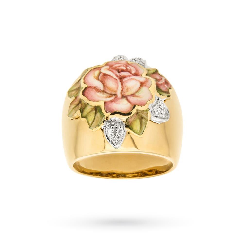Questo anello di Gabriella Rivalta è un anello a fascia abbellito con una rosa smaltata al centro.