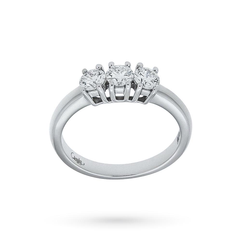 Anello trilogy oro diamanti 0,77ct Mirco Visconti. Questo anello trilogy con diamanti taglio brillante è un gioiello Made in Italy con ottime caratteristiche qualitative creato dal brand di gioielli di Valenza Mirco Visconti. La montatura è eseguita in elegante e prezioso oro bianco 18kt, anallergico, nickel free. Ogni diamante è sostenuto da quattro solide griff, che ne massimizzano la lucentezza e la sicurezza. Al centro sono posizionati quindi tre magnifici diamanti naturali. E' accompagnato da una elegante scatola regalo e da garanzia ufficiale Mirco Visconti. Dal momento dell'acquisto il gioiello è coperto da assicurazione contro furto, scippo, rapina e incendio per la durata di un anno. Curiosità : L'anello trilogy è adatto ad ogni occasione della vita di coppia: la nascita di un figlio, la proposta di fidanzamento e soprattutto rappresenta per chi lo riceve un ricordo intramontabile. I tre diamanti simboleggiano infatti Ieri, oggi e domani, e comunicano un concetto di amore infinito ed eterno. Nel caso di acquisto online la spedizione è coperta da un’assicurazione offerta dalla Gioielleria Cicala. NB. Nel caso in cui l’anello non sia in stock ma sia da ordinare al produttore, è possibile che venga creato e consegnato con piccole differenze non sostanziali di caratura e pesi, a testimonianza dell’artigianalità ed unicità di ogni gioiello firmato Mirco Visconti.