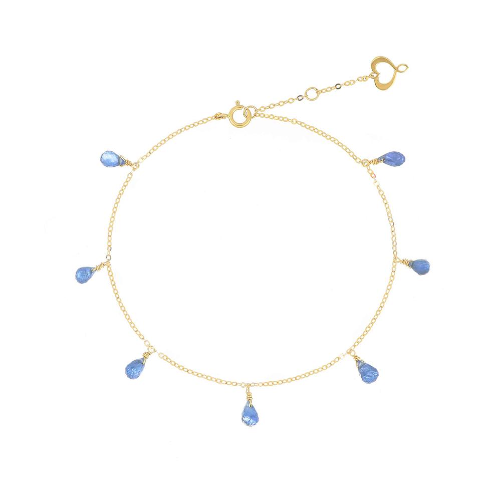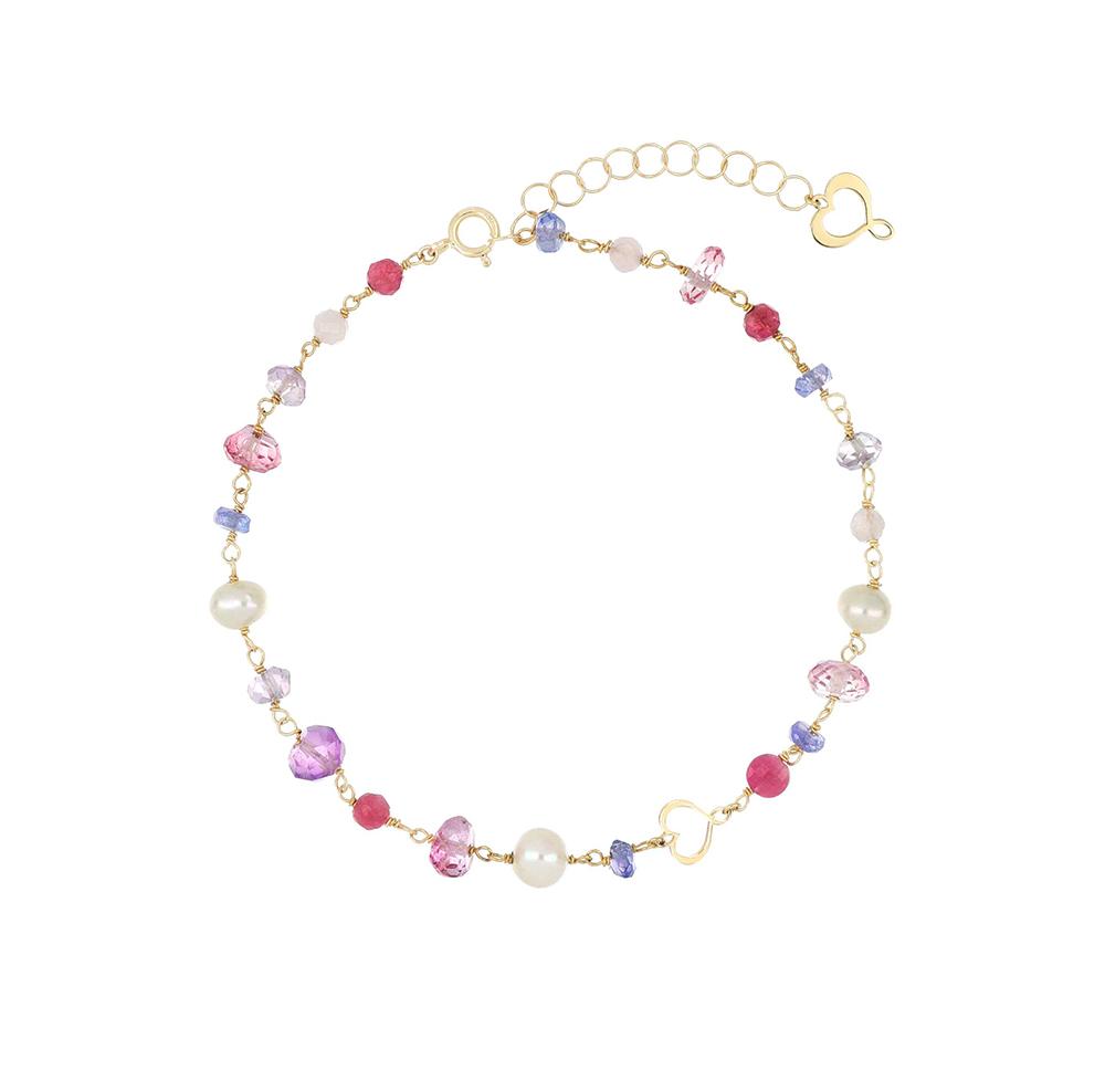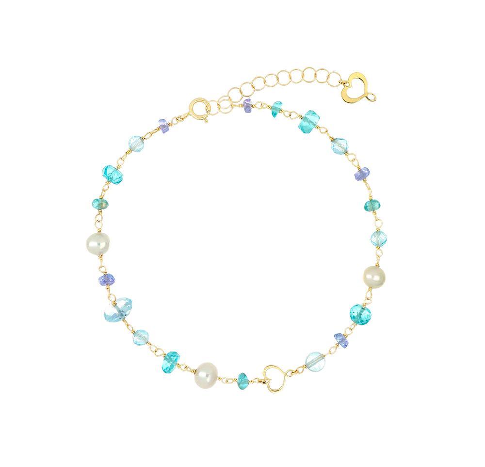 Bracciale 18Kt Nuvole Azzurro Maman et Sophie BRNUVCRAZ. Bracciale in oro giallo 18 carati con pietre di Topazio azzurro, Apatite, Acquamarina, Tanzanite, Perla bianca alternate a catena e cuore maman traforato.