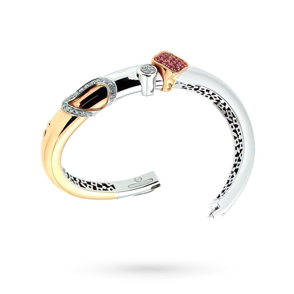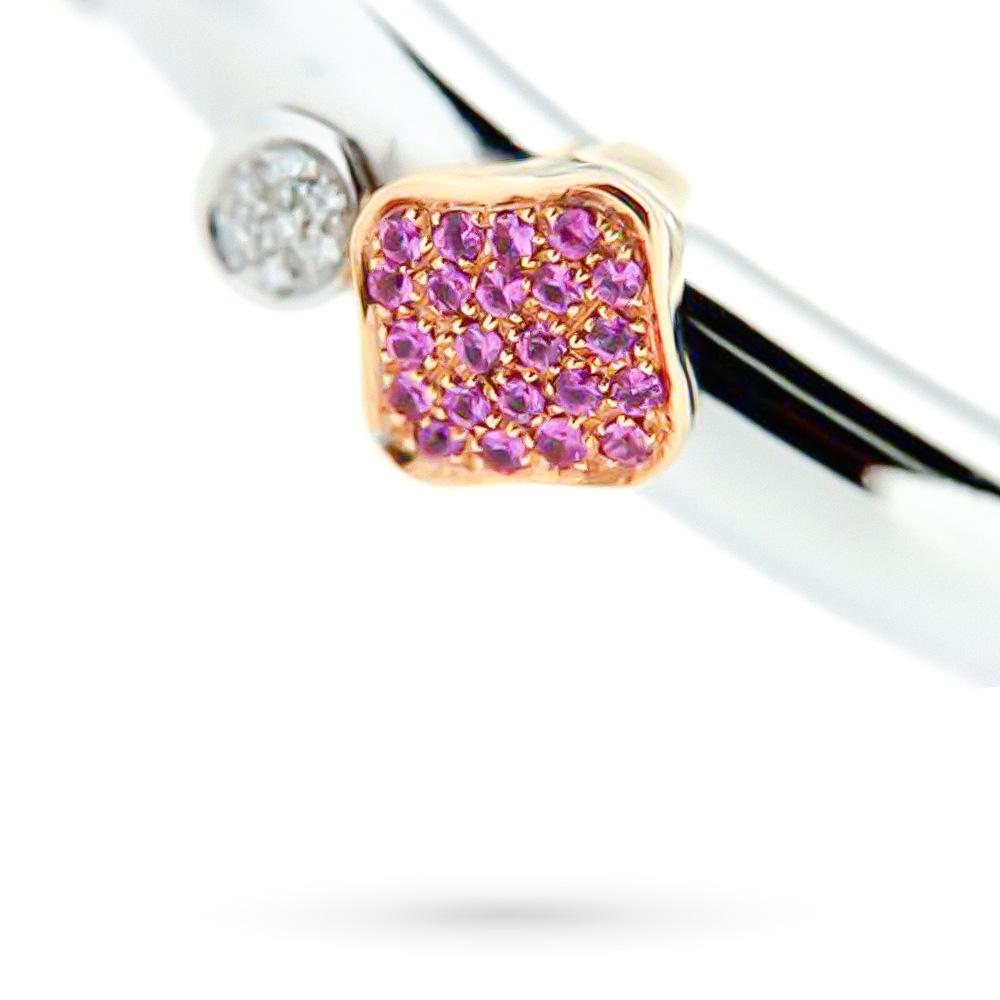 Il bracciale è impreziosito da zaffiri rosa 0,83ct e diamanti taglio brillante 0,45ct, che ne esaltano la raffinatezza e il valore. L’interno è lavorato con un elegante traforo dalle forme armoniose, testimonianza della straordinaria maestria orafa.