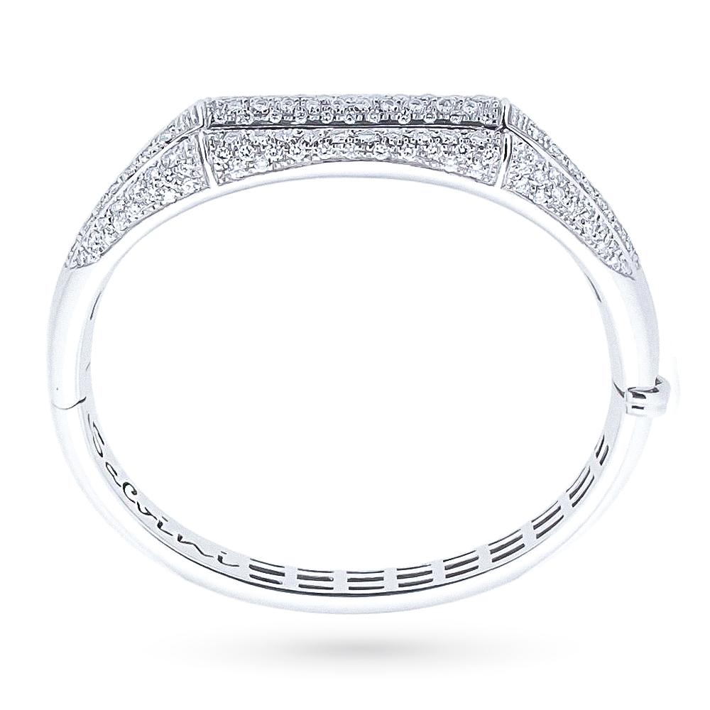 Bracciale Salvini oro bianco manetta pavè diamanti 4,21ct. Questo gioiello è un capolavoro Made in Italy firmato Salvini gioielli. La manetta rigida è interamente realizzata in prezioso oro bianco 18kt, luminoso e affascinante. Tutta la superficie è poi abbellita da un fitto pavè di magnifici diamanti taglio brillante con colore H e purezza VS, con caratura complessiva di ben 4,21ct. E' un gioiello d'Alta Gioielleria realizzato artigianalmente e rifinito in ogni suo aspetto: anche all'interno del gambo nulla è lasciato al caso, come evidenziato dalla firma Salvini traforata nell'oro. Il sistema di sicurezza ad innesto è incredibilmente sicuro e pratico, e consente di indossare il gioiello con estrema facilità.