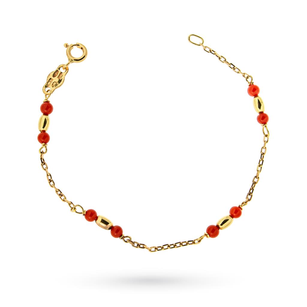 E' composto da una solida sottile catena a cui si alternano ovalini d'oro e sfere di corallo rosso.