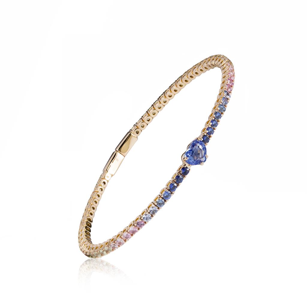 Il gioiello che stai osservando è un bracciale rigido della marca RF Jewewls realizzato interamente in oro giallo 18kt con zaffiri colorati arcobaleno tendente all'azzurro di taglio rotondo brillante 3,32ct e uno zaffiro blu centrale taglio cuore 1,08ct.