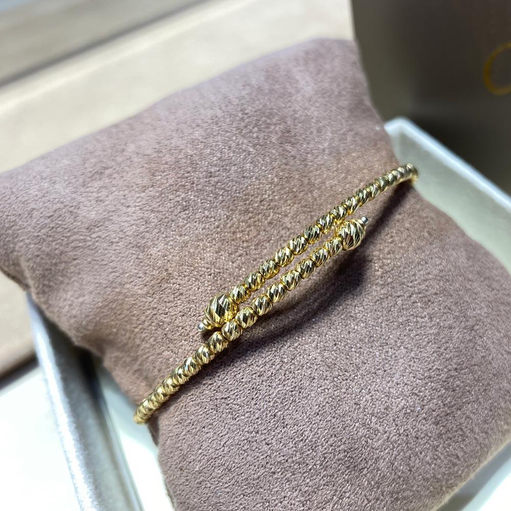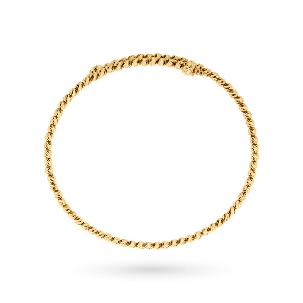 Questo magnifico bracciale rigido in oro giallo è composto da una fitta successione di sferette d'oro giallo 18kt diamantate. Il risultato estetico finale è un tripudio di luce grazie ai bagliori e ai riflessi che vengono a crearsi. Nonostante la sua rigidità è pratico e confortevole: si indossa facilmente al polso e si sposa perfettamente con ogni look, dal classico al più trendy.