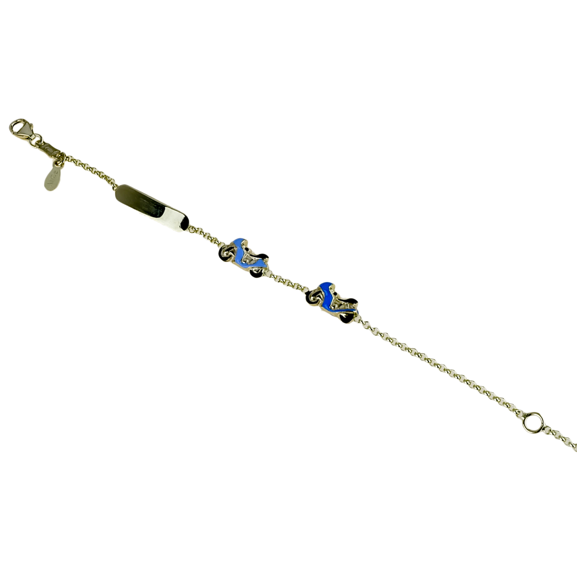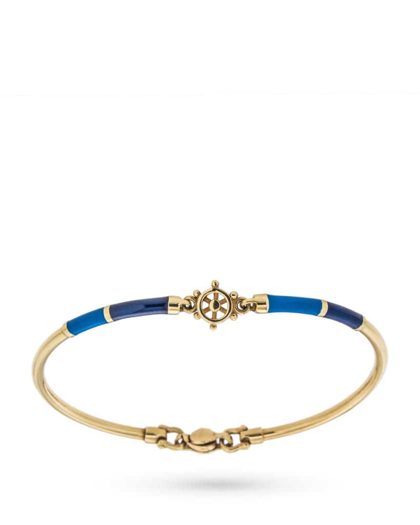 Bracciale in oro giallo semirigido, canna smaltata di azzurro e blu e timone centrale.