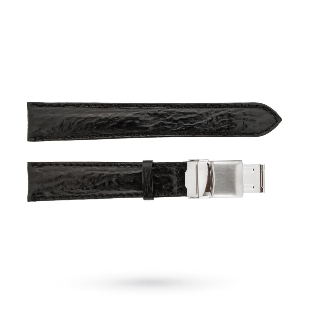 Cinturino per orologi artigianale in pelle di squalo di colorazione nera e cuciture nere.