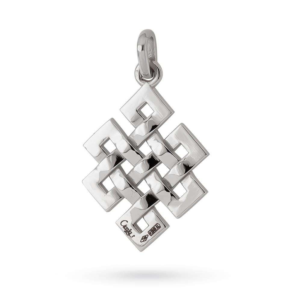 Questo magnifico ciondolo con infinito tibetano è realizzato in prezioso oro bianco 18kt.